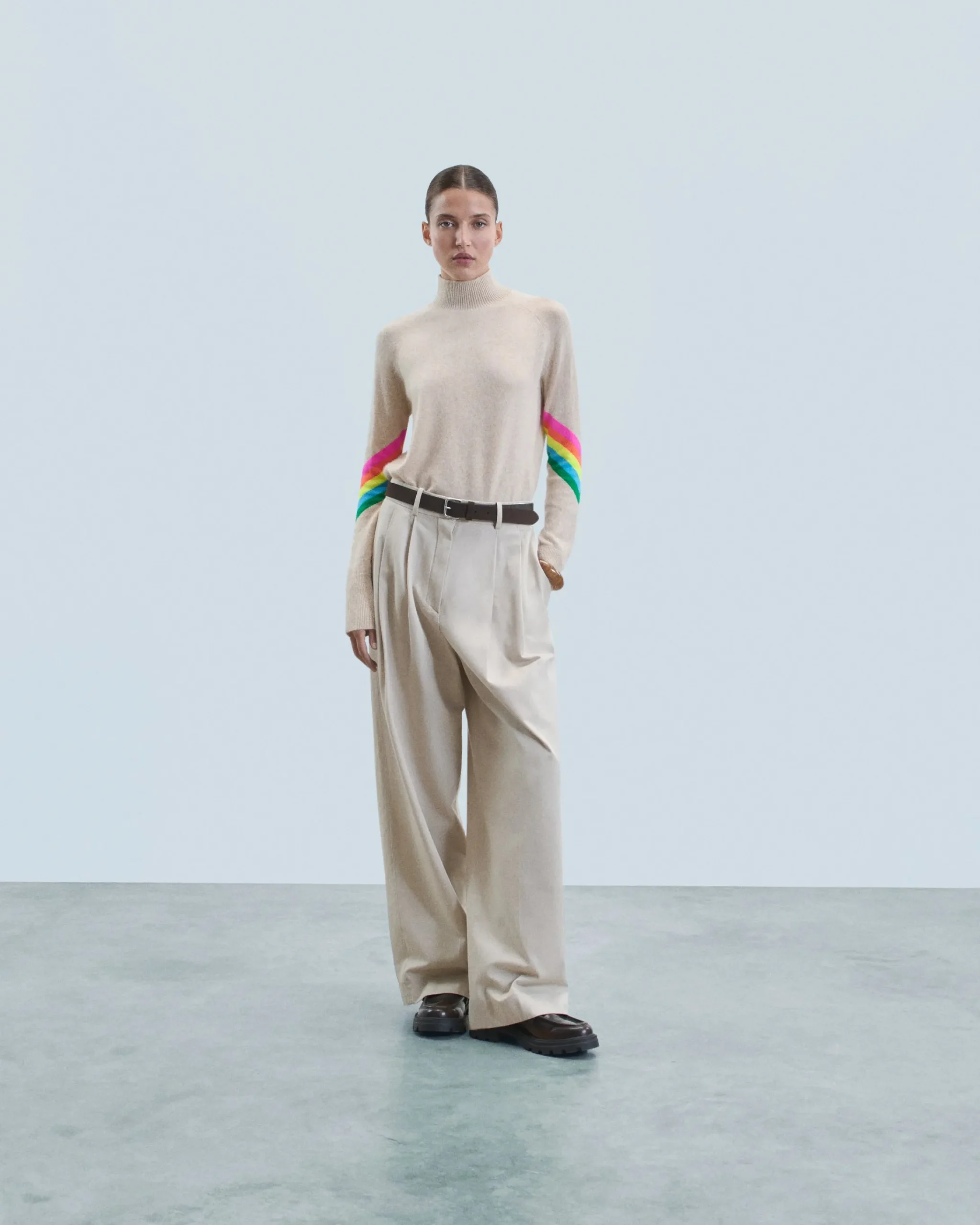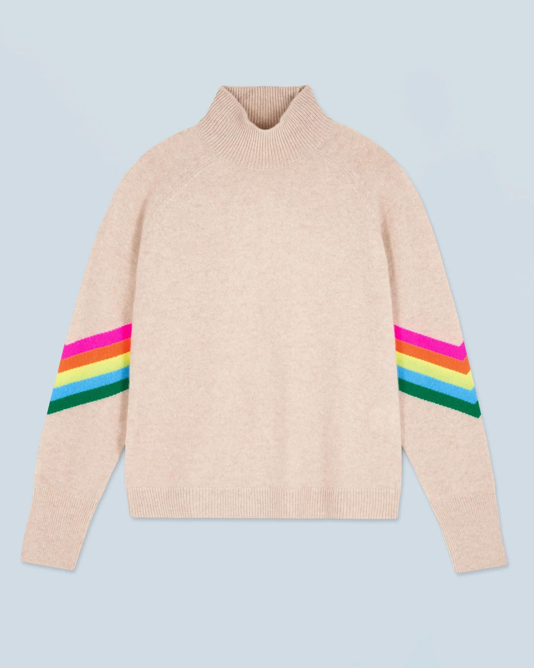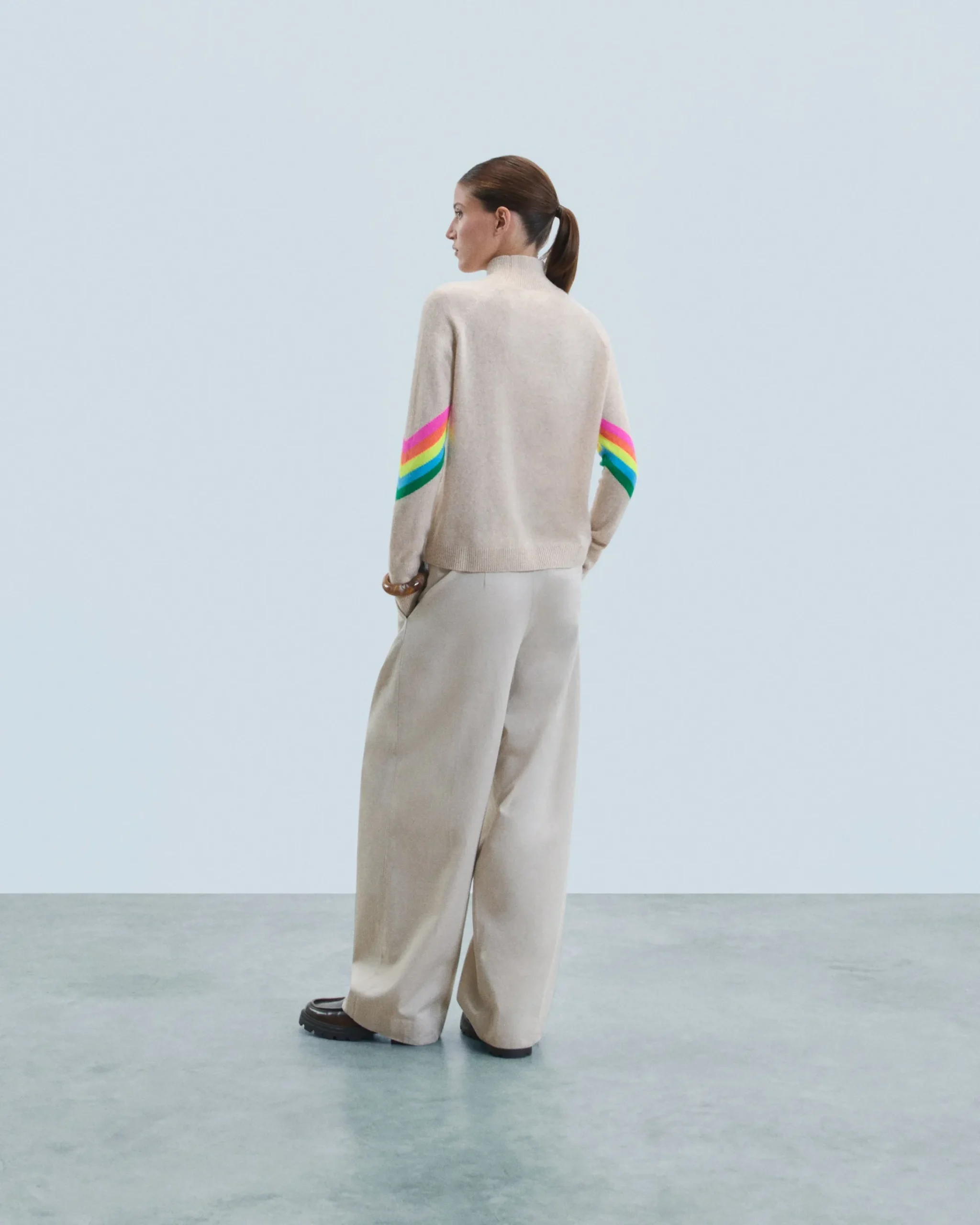 Pezzo iconico del guardaroba From Future, questo maglione corto in cashmere leggero è vivacizzato da bande multicolori sulle maniche. Con un collo alto e bordi a coste, ravviverà il tuo look di stagione con un tocco audace. Indossalo con un paio di pantaloni larghi o una gonna morbida!