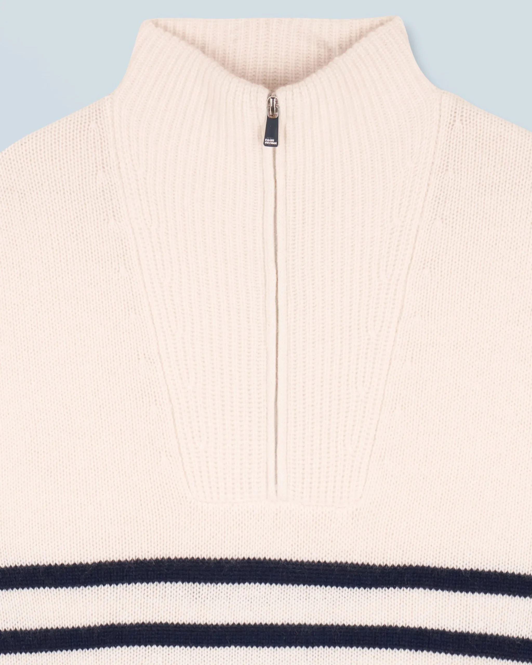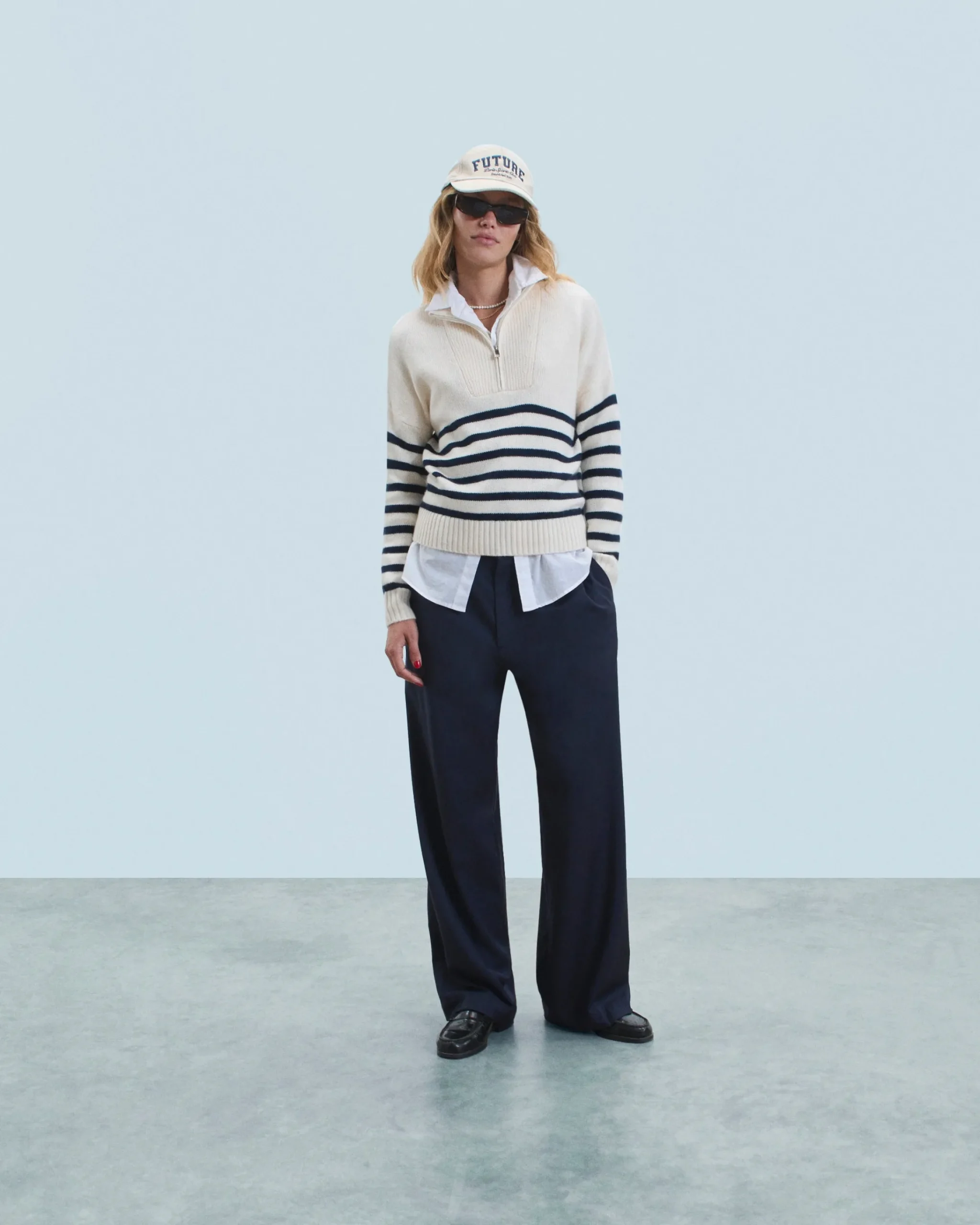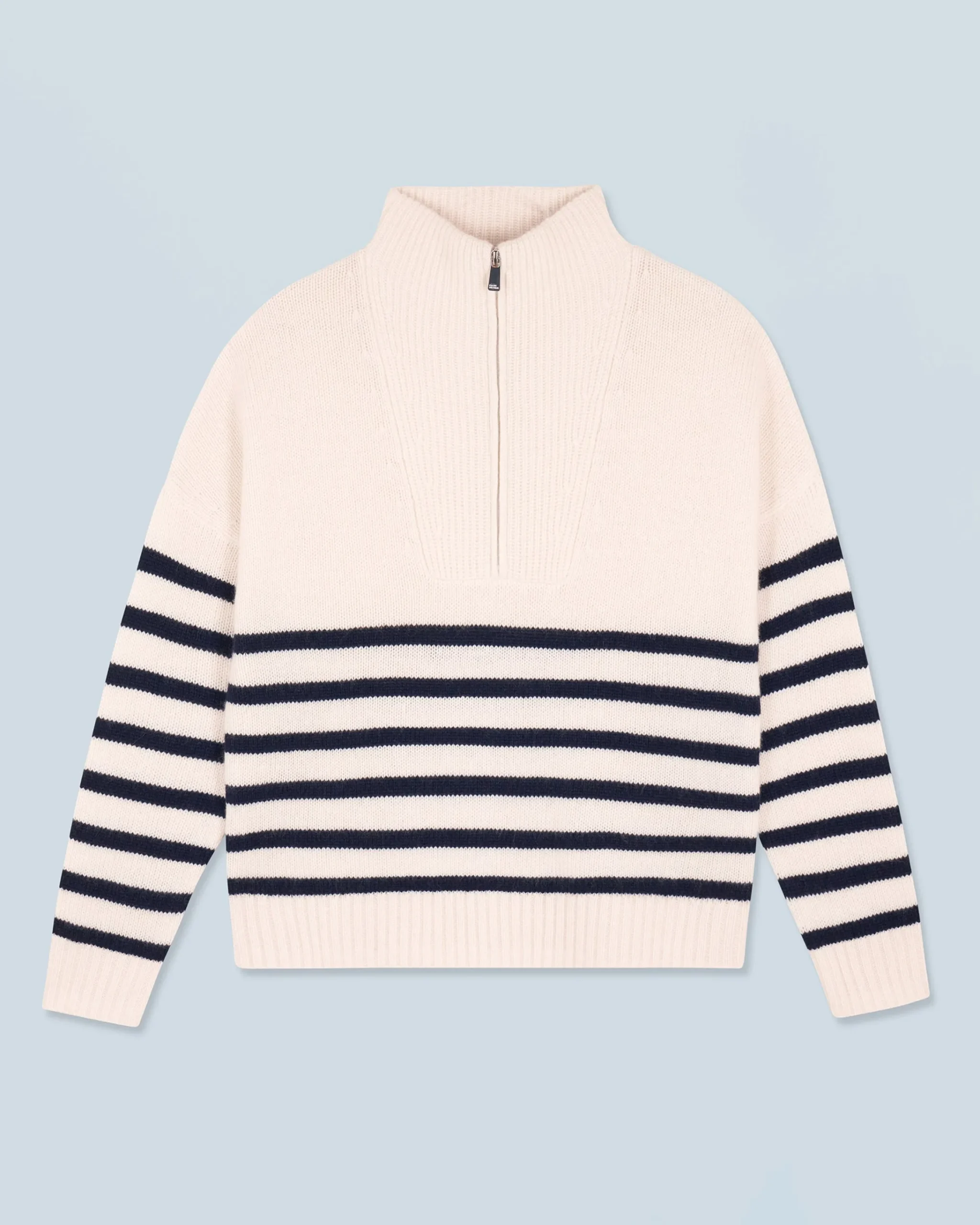 L’irrinunciabile maglione marinière si reinventa in una versione oversize e confezionata in cashmere. Vivacizzato da righe a contrasto, presenta un collo alto con zip, maniche lunghe e bordi a coste. Elegante e senza tempo, puoi abbinarlo a un paio di jeans a gamba larga e una giacca strutturata.