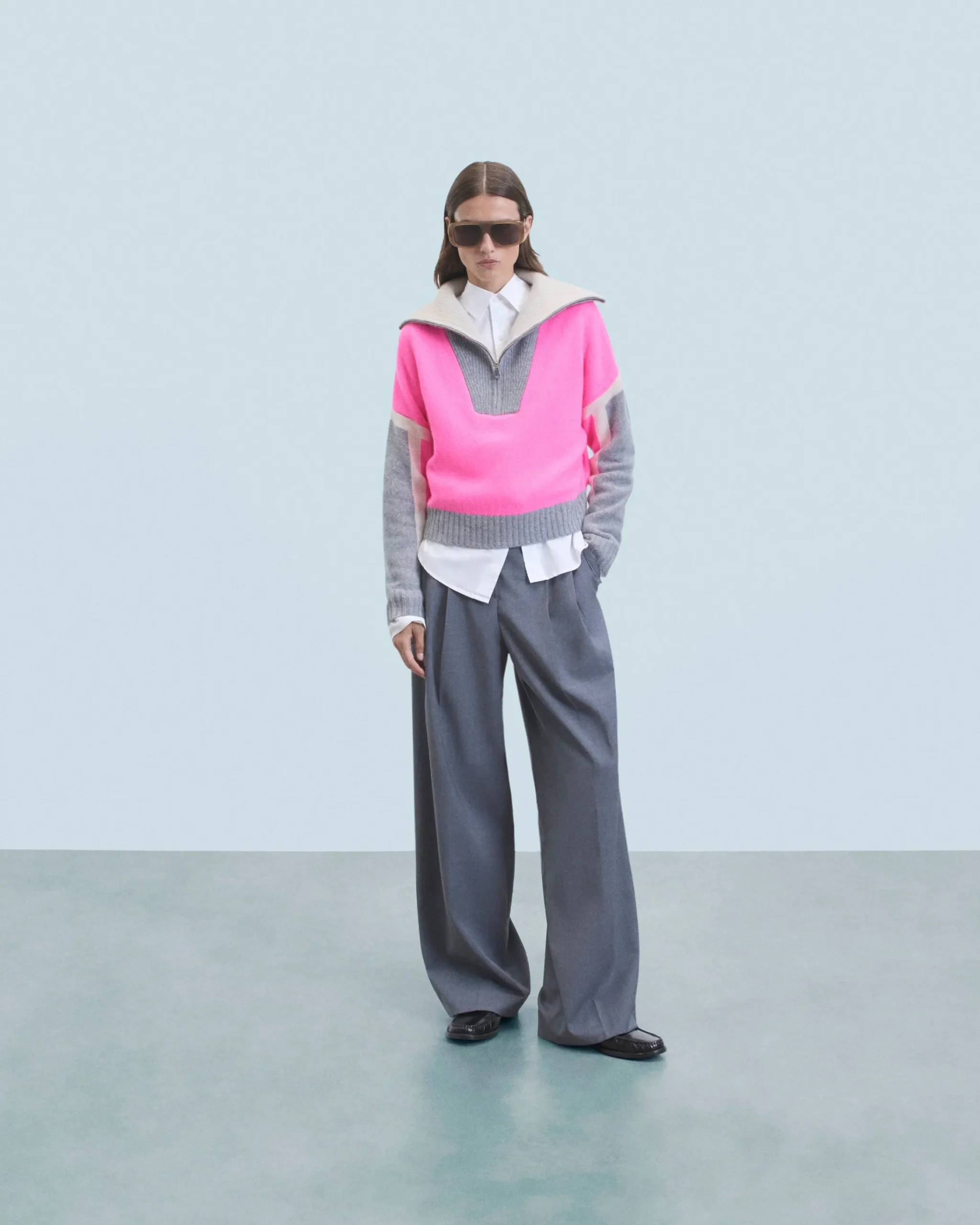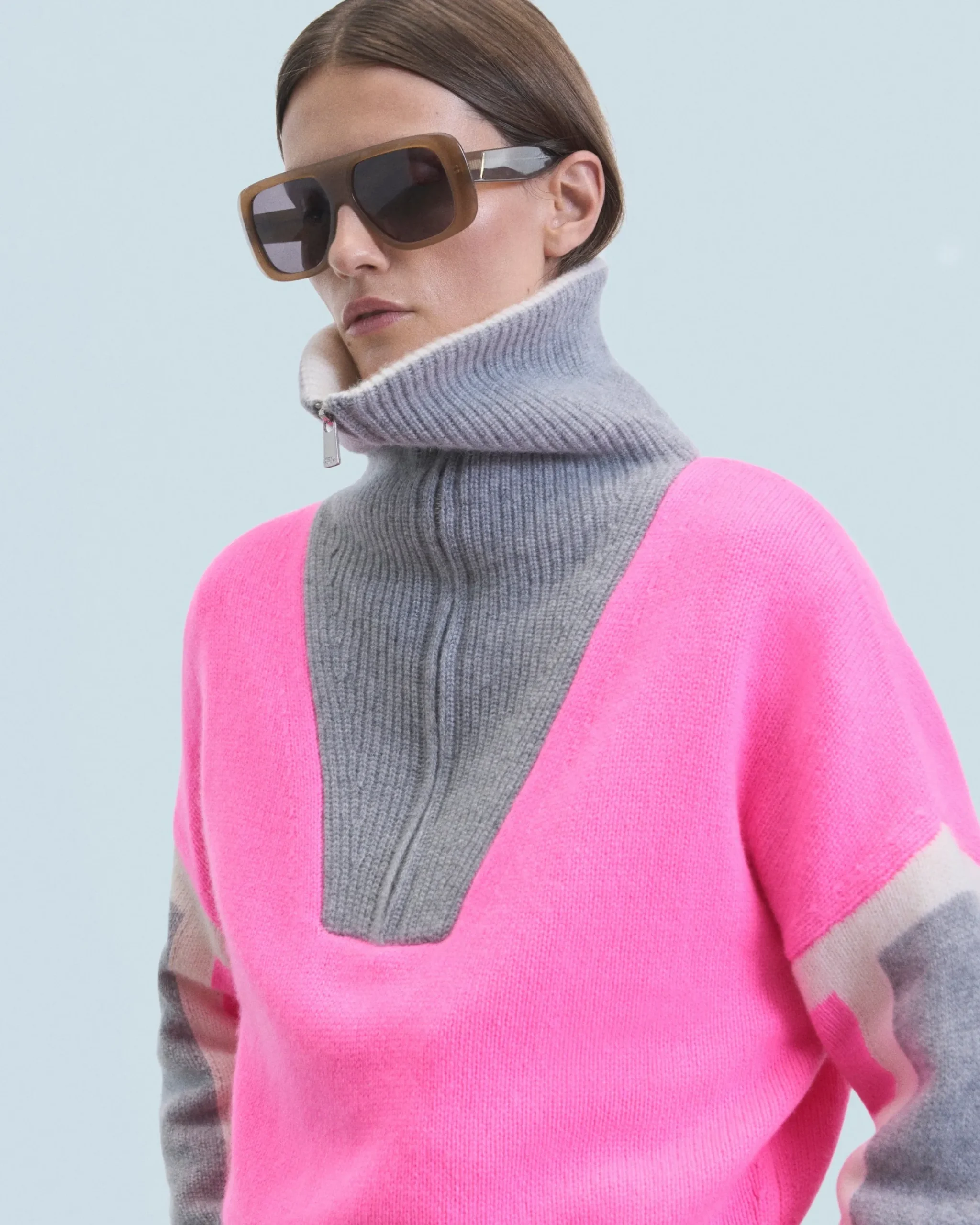 Taglio impeccabile e linee decise: questo maglione tricolore è arricchito da bande a contrasto per un look elegante e strutturato. Realizzato in cashmere, presenta un collo a camionista, maniche lunghe e bordi a coste. Decisamente audace, si abbina perfettamente a un jeans strutturato o a una gonna fluida. – Maglione tricolore in cashmere certificato GCS® Donna – Bande a contrasto – Collo a camionista – Maniche lunghe – Bordi a coste – Vestibilità regular – Il Good Cashmere Standard® (GCS) è uno standard indipendente per un cashmere più sostenibile e responsabile. Mira a migliorare il benessere delle capre da cashmere, le condizioni di lavoro degli allevatori e a proteggere l’ambiente.- Cashmere 6 fili
