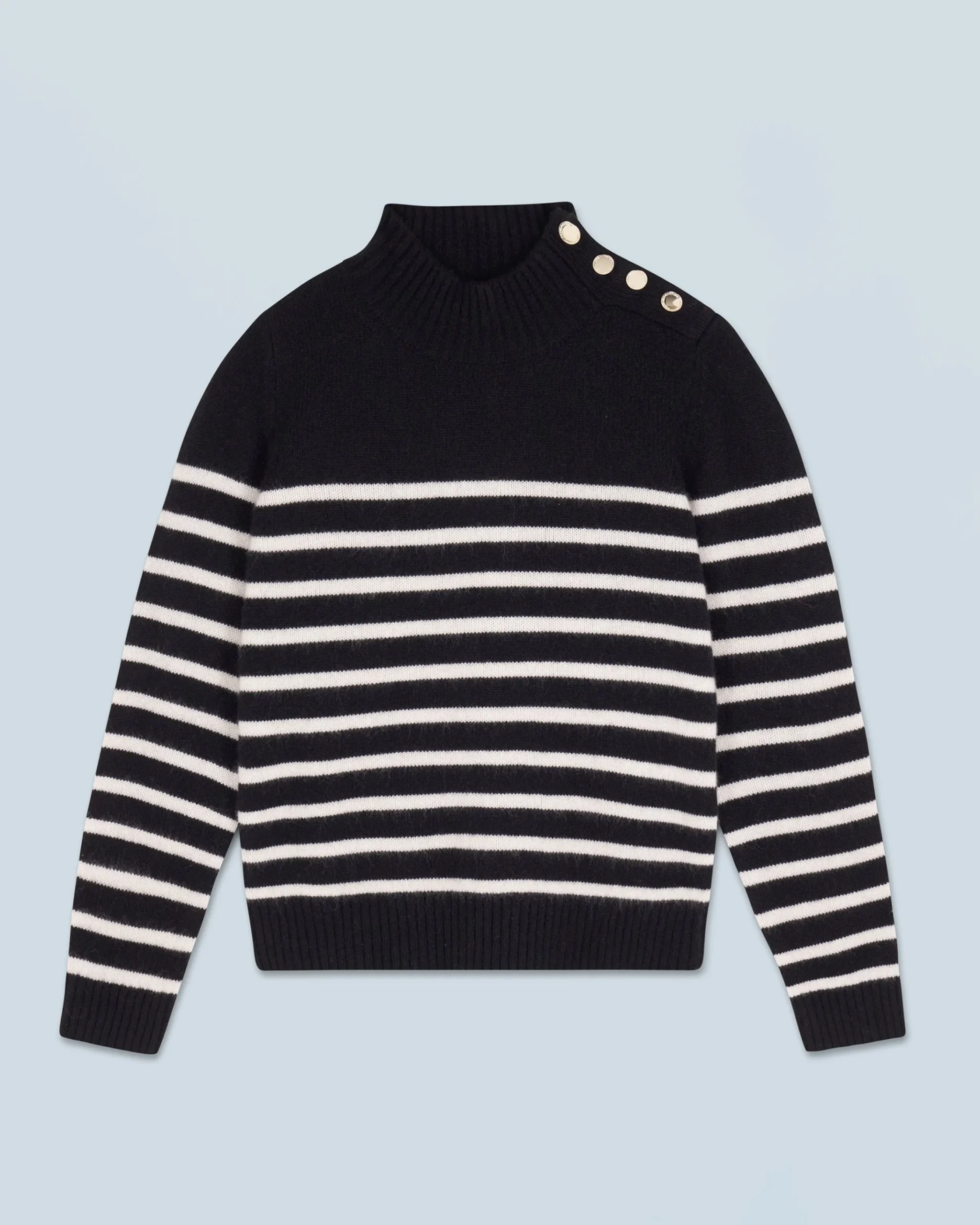 L’intramontabile maglione marinière si reinventa con un tocco di audacia! Confezionato in cashmere, presenta maniche lunghe, un collo alto e bordi a coste. Vivacizzato da bottoni sulle spalle, le sue righe a contrasto conferiscono al tuo look uno stile rilassato ma elegante. Facile da abbinare, puoi indossarlo sopra un vestito morbido o con un paio di jeans casual.