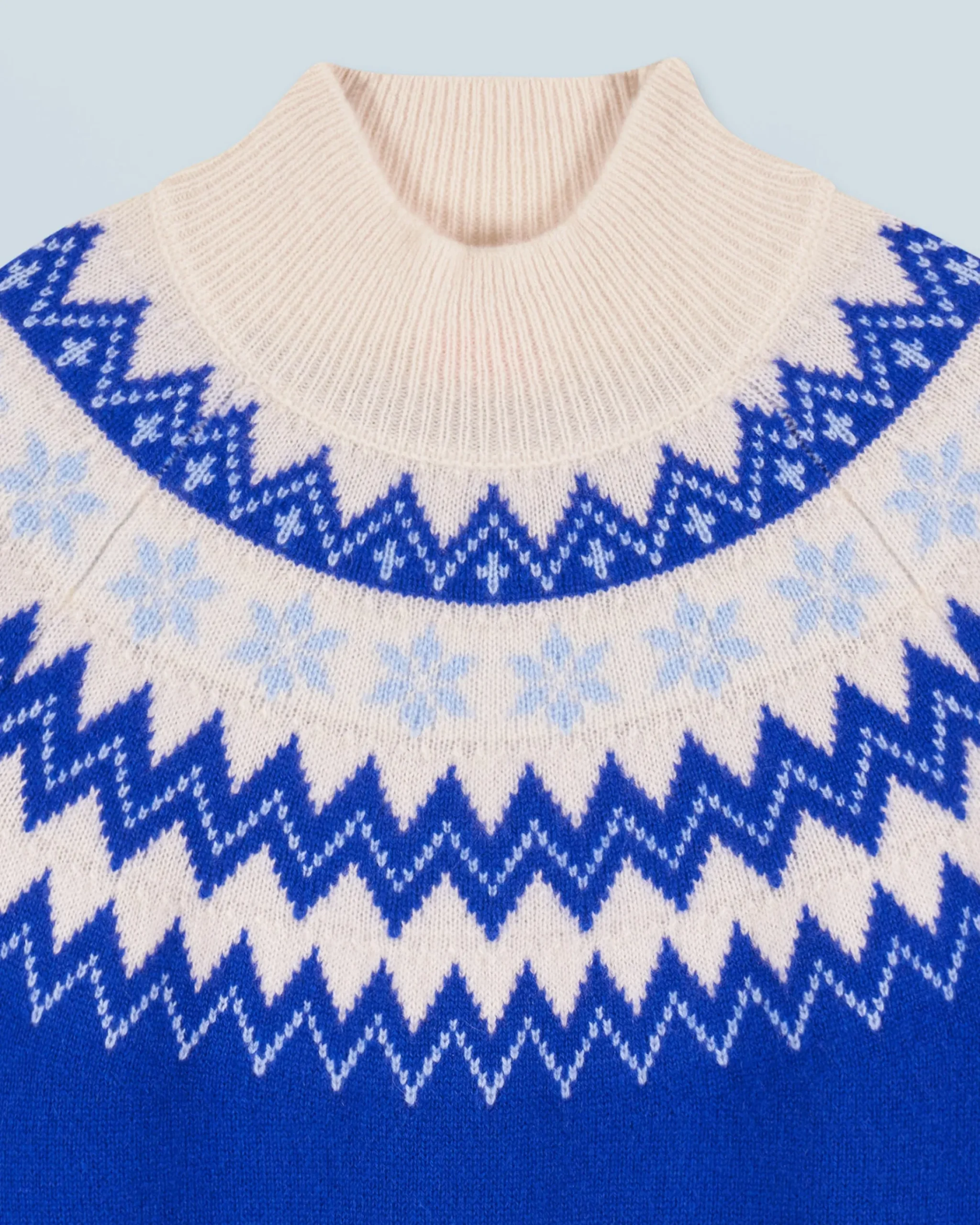 Ravviva il tuo look di stagione con questo maglione corto impreziosito da motivi norvegesi! Confezionato in cashmere, presenta un collo alto, maniche lunghe e bordi a contrasto. Adotta un look casual e mixalo con un pantalone dritto o una gonna morbida!