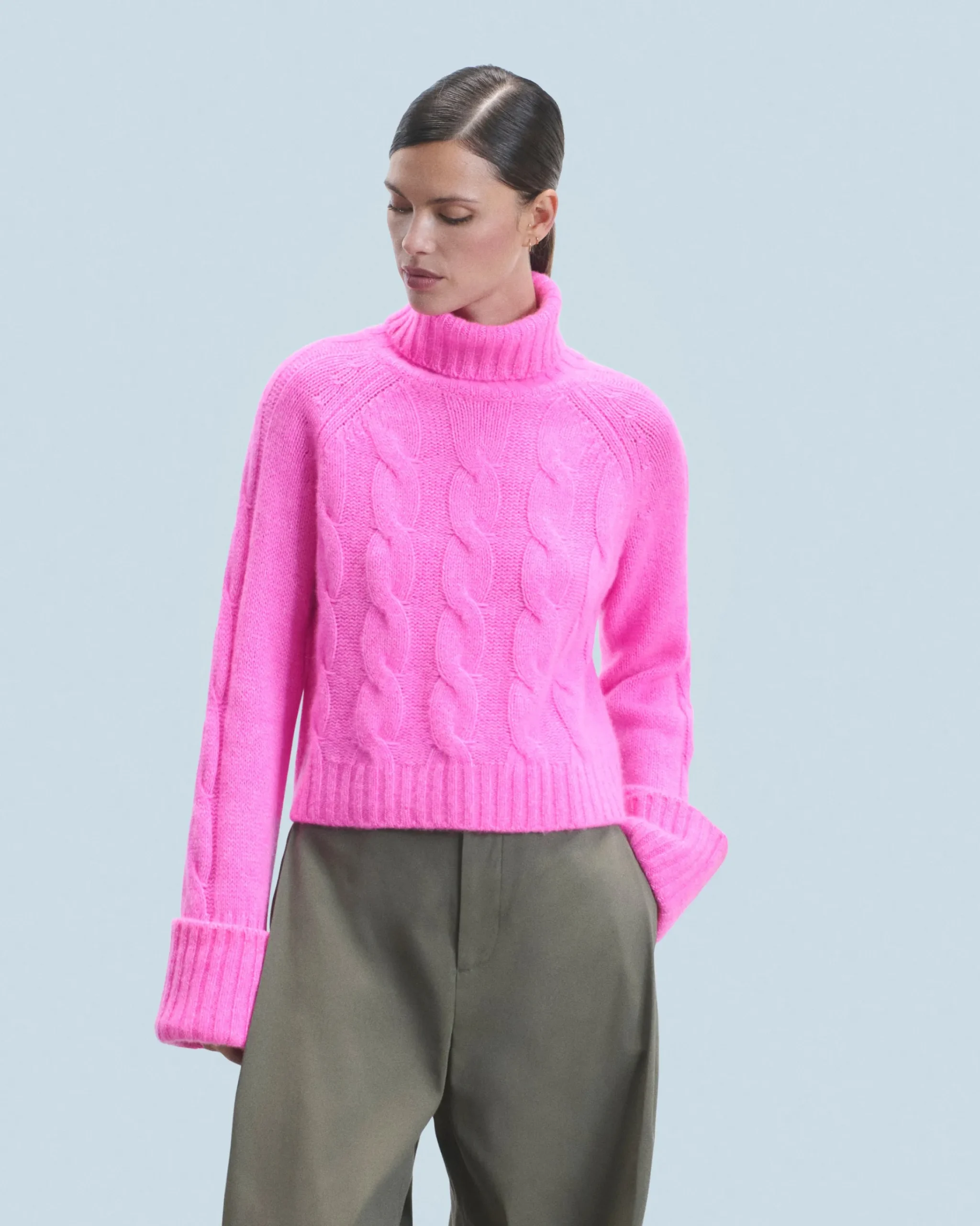 Illumina il tuo look di stagione con questo maglione corto realizzato in cashmere! Vivacizzato da lavorazioni a trecce, presenta un collo a dolcevita, maniche lunghe e bordi a coste per riscaldare il tuo outfit con stile. Indossalo con un paio di jeans a gamba larga o una gonna morbida per un look chic e casual!