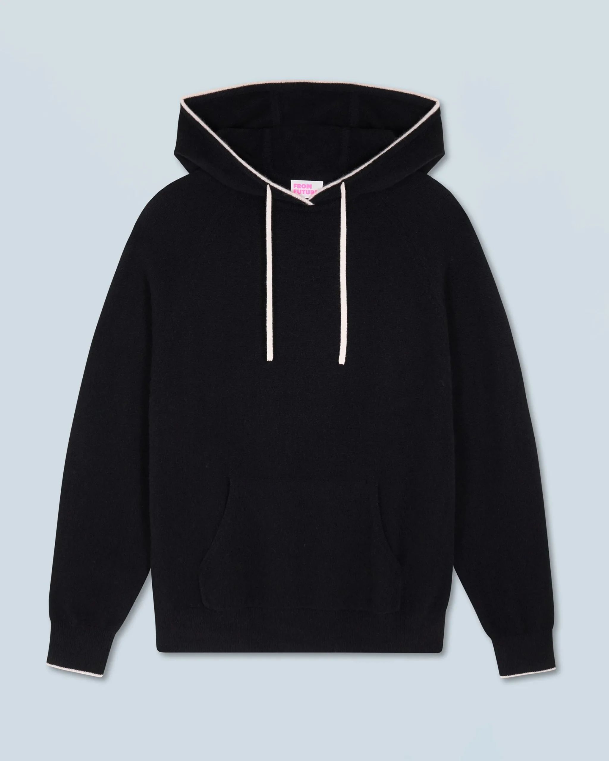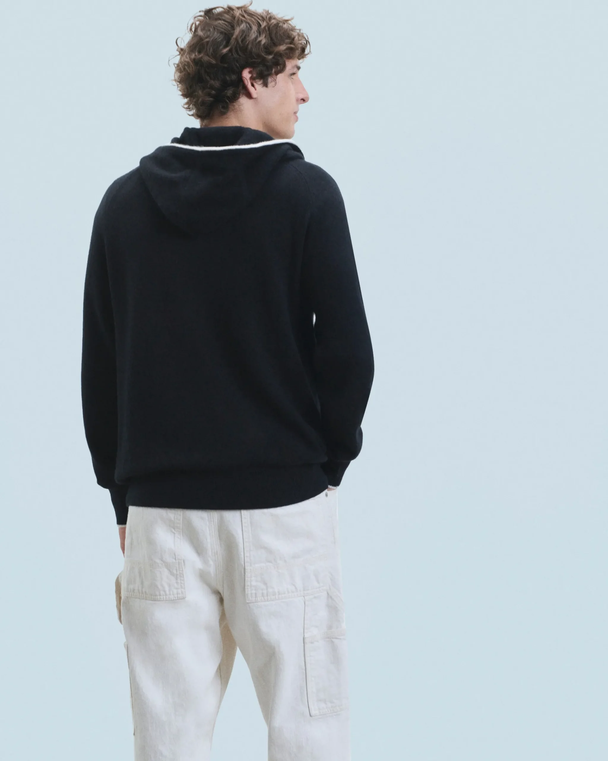 L’irrinunciabile felpa-maglione si reinventa per questa stagione con bordini a contrasto. Confezionata in cashmere, presenta un cappuccio con cordoncini, maniche lunghe e bordi a coste. Oversize e strutturata, puoi abbinarla a una t-shirt e un paio di jeans.
