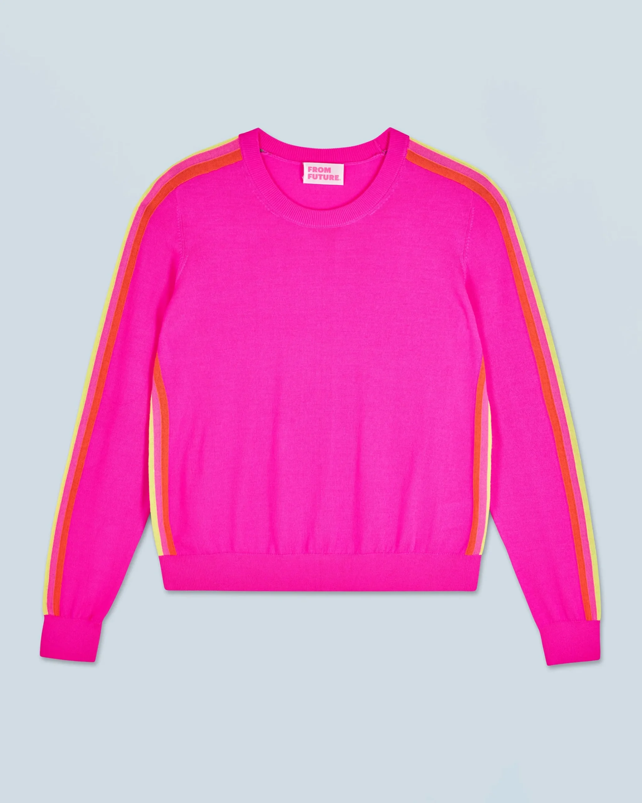 Segni distintivi del look From Future, bande multicolori contrastanti si mostrano su questo maglione audace. Realizzato in 100% lana merino certificata RWS (Responsible Wool Standard), presenta un collo rotondo e maniche lunghe. Completa il tuo look abbinandolo a una gonna fluida o a un jeans ampio. – Maglione in lana merino Donna – Bande multicolori – Collo rotondo – Maniche lunghe – Vestibilità regular – Lana merino: traspirante e termoregolatrice, può essere indossata sia d’estate che d’inverno