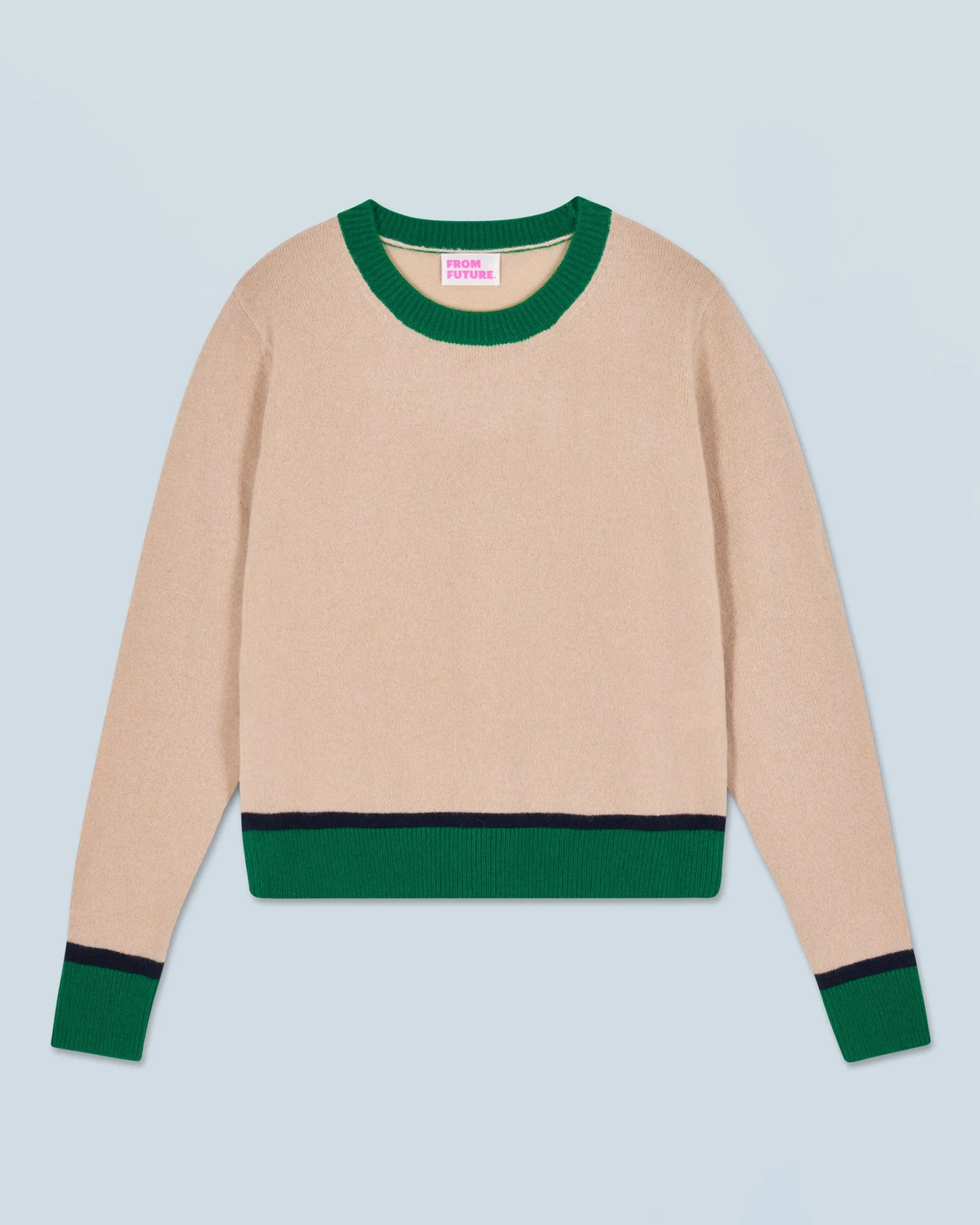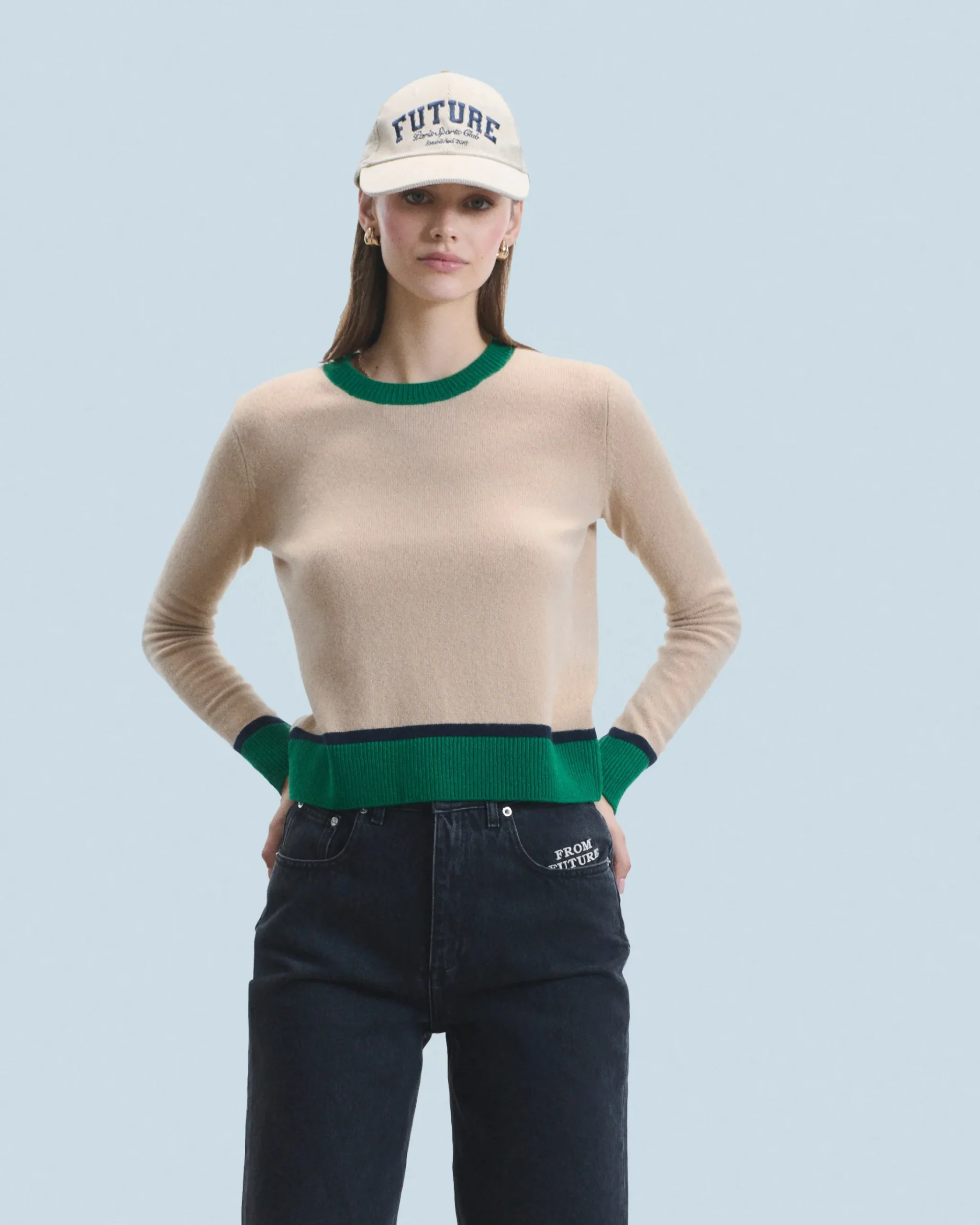 Impregnato di morbidezza e di leggerezza, questo maglione corto confezionato in cashmere presenta uno scollo tondo e maniche lunghe. I suoi bordi bicolore a contrasto strutturano il tuo look con eleganza. Componi un outfit casual mixandolo con un paio di jeans a gamba dritta o una gonna morbida!