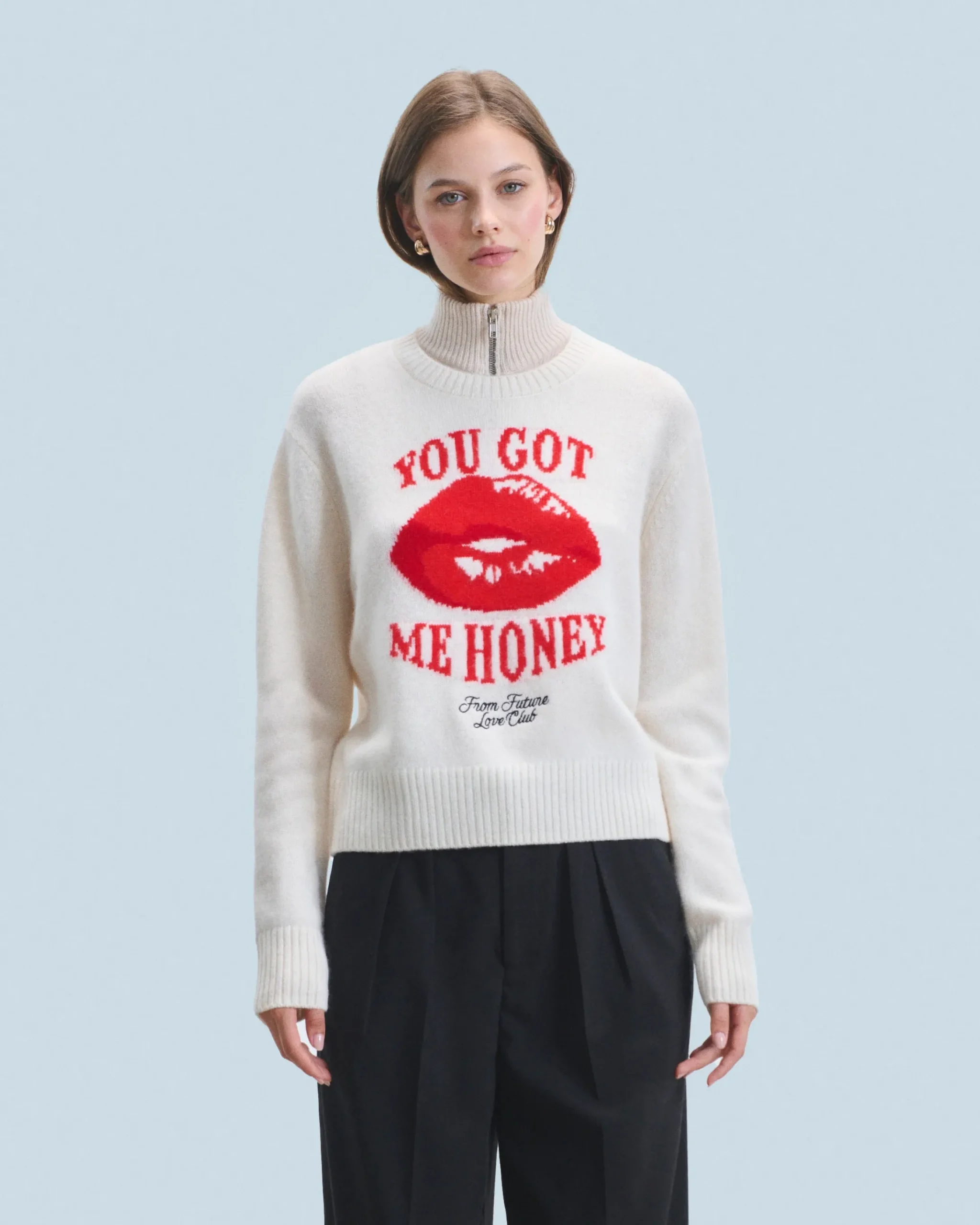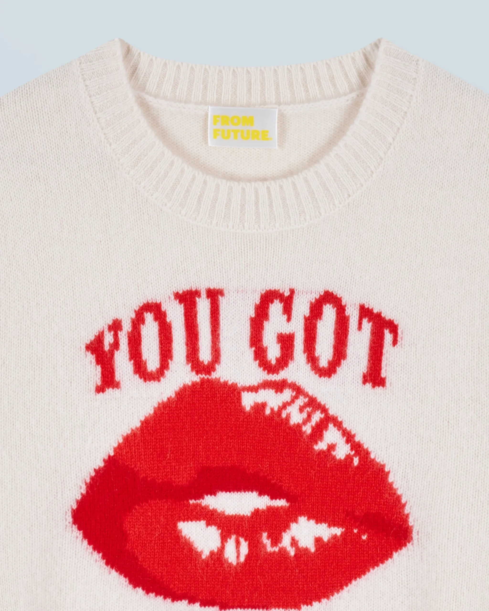Lasciati conquistare da questo maglione audace, decorato con il motivo red lips “You Got Me Honey” irresistibile. Realizzato in cashmere, è dotato di un collo rotondo, maniche lunghe e bordi a coste. – Maglione in cashmere certificato GCS® Donna – Motivo red lips “You Got Me Honey” – Collo rotondo – Maniche lunghe – Bordi a coste – Vestibilità regular – Il Good Cashmere Standard® (GCS) è uno standard indipendente per un cashmere più sostenibile e responsabile. Mira a migliorare il benessere delle capre da cashmere, le condizioni di lavoro degli allevatori e a proteggere l’ambiente.- Cashmere 4 fili