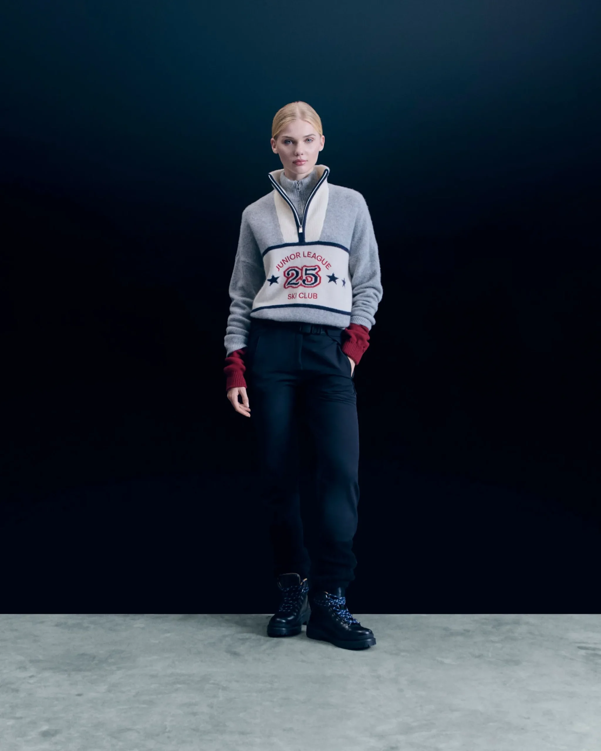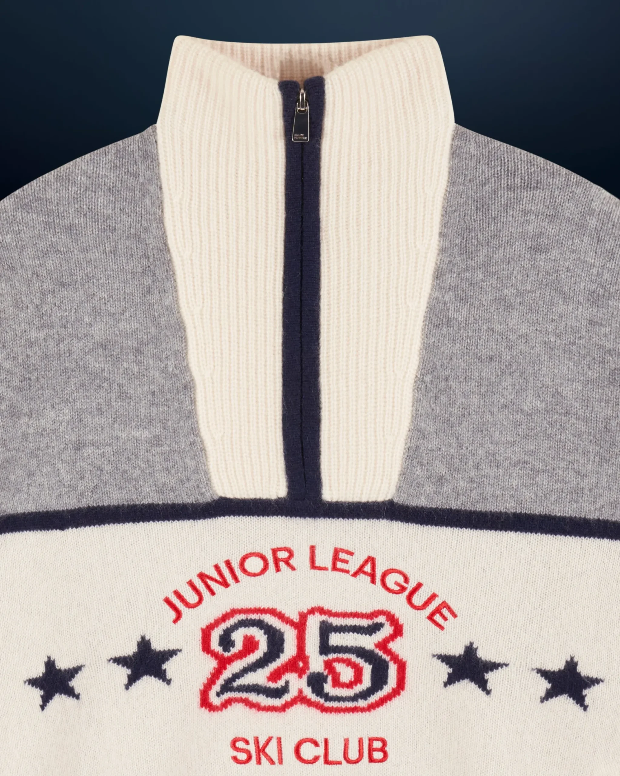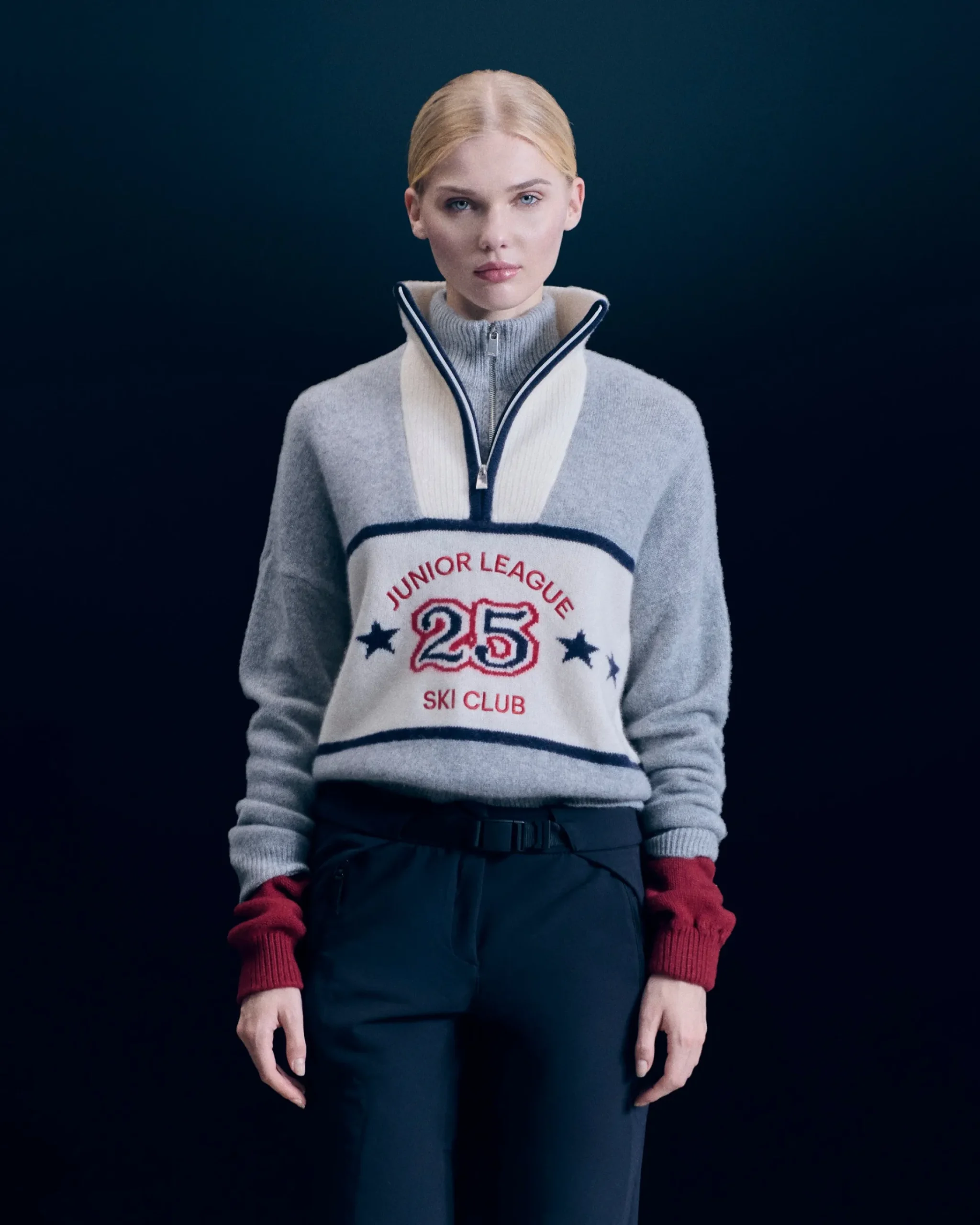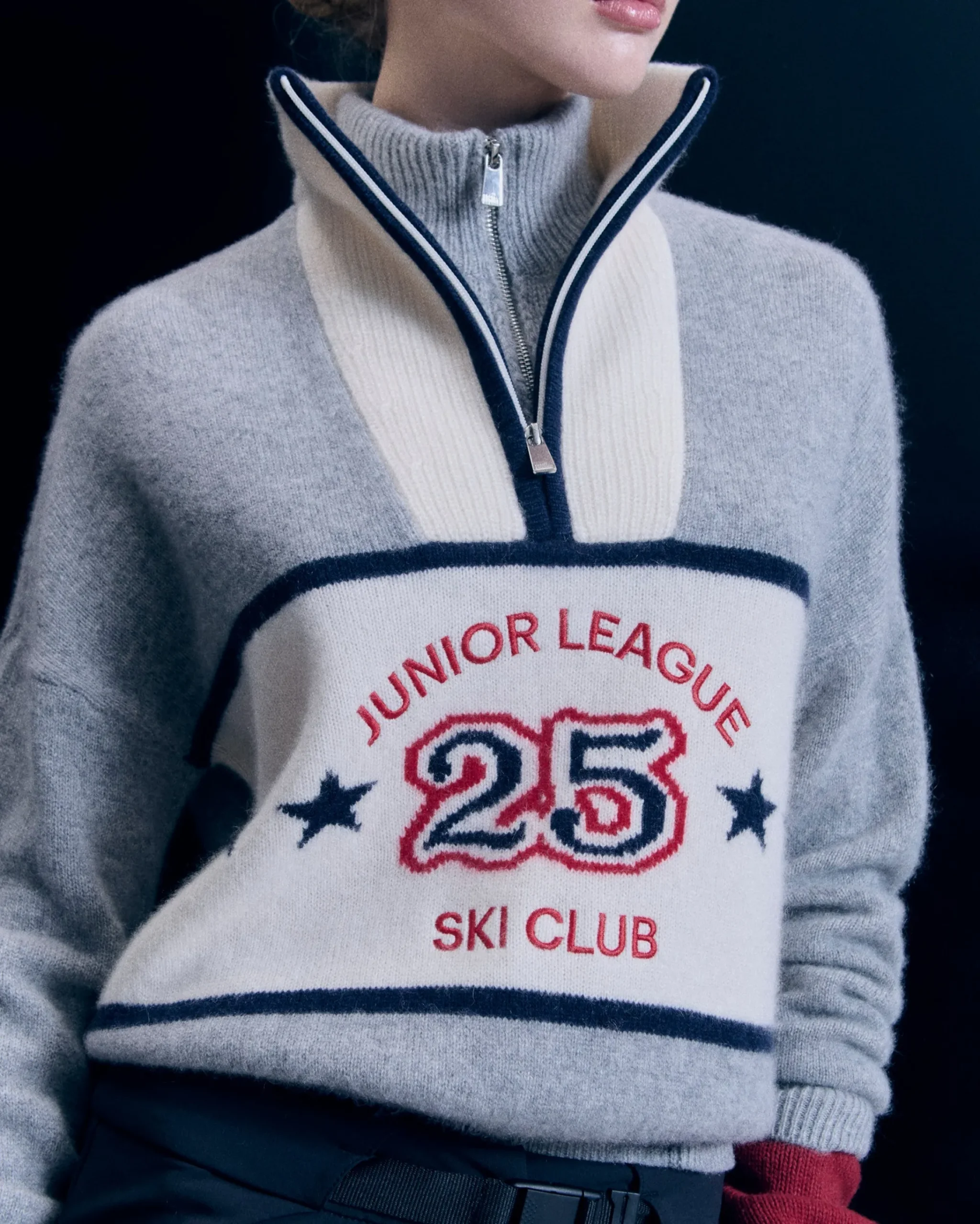 Porta il tuo stile sulle cime innevate con questo maglione vivacizzato da bande a contrasto e dal motivo “Junior League”! Realizzato in cashmere, presenta un collo alto con zip e maniche lunghe, per un outfit strutturato. Dai un twist al tuo look di stagione abbinandolo a un paio di pantaloni a gamba larga o una gonna in maglia!