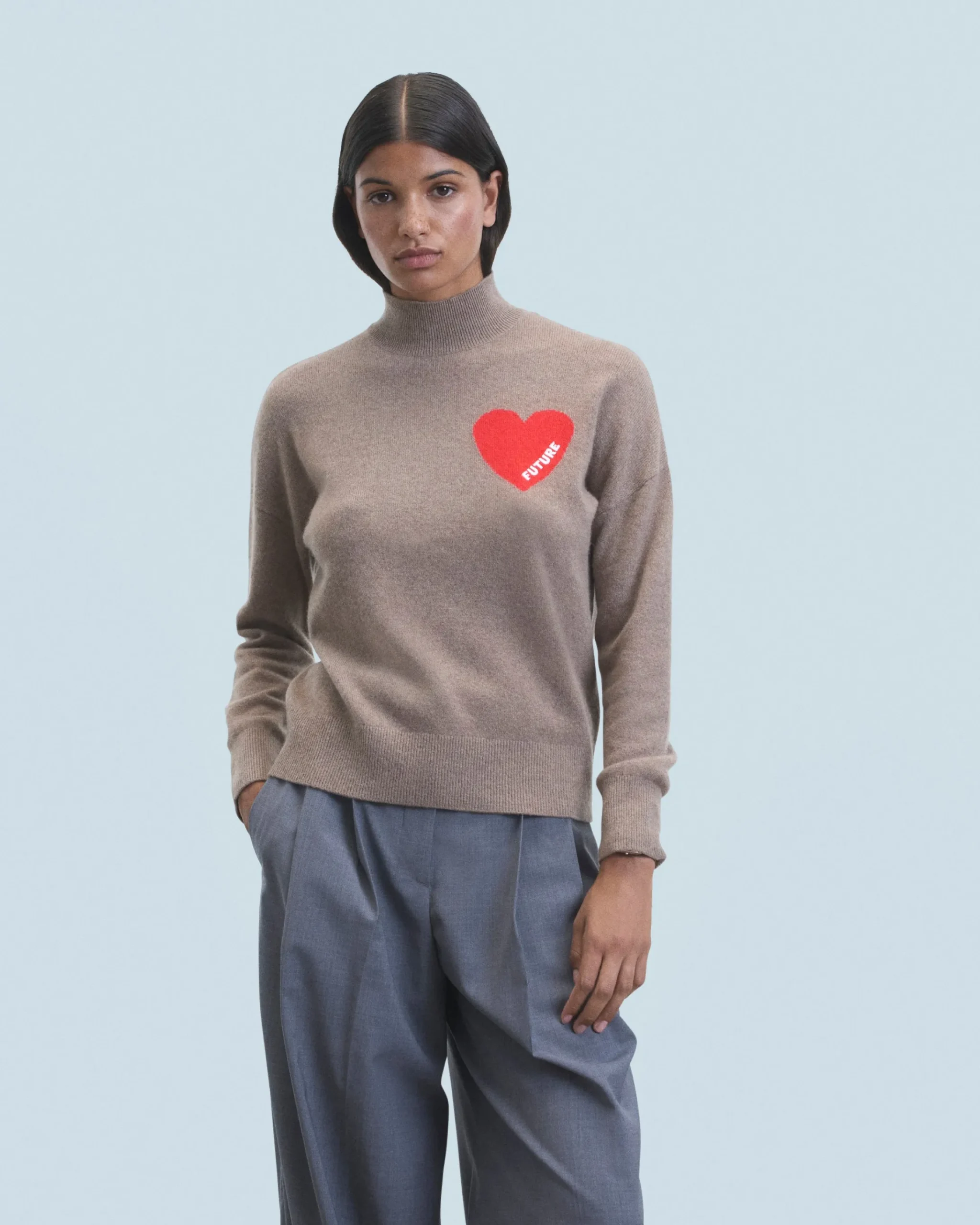 Un filato leggero e infinitamente morbido per questo maglione oversize confezionato in cashmere! Con un collo alto, maniche lunghe e bordi a coste, presenta un cuore impreziosito dal ricamo FUTURE sul petto. Adotta un look casual-chic mixandolo con una gonna morbida o un pantalone da tailleur strutturato!