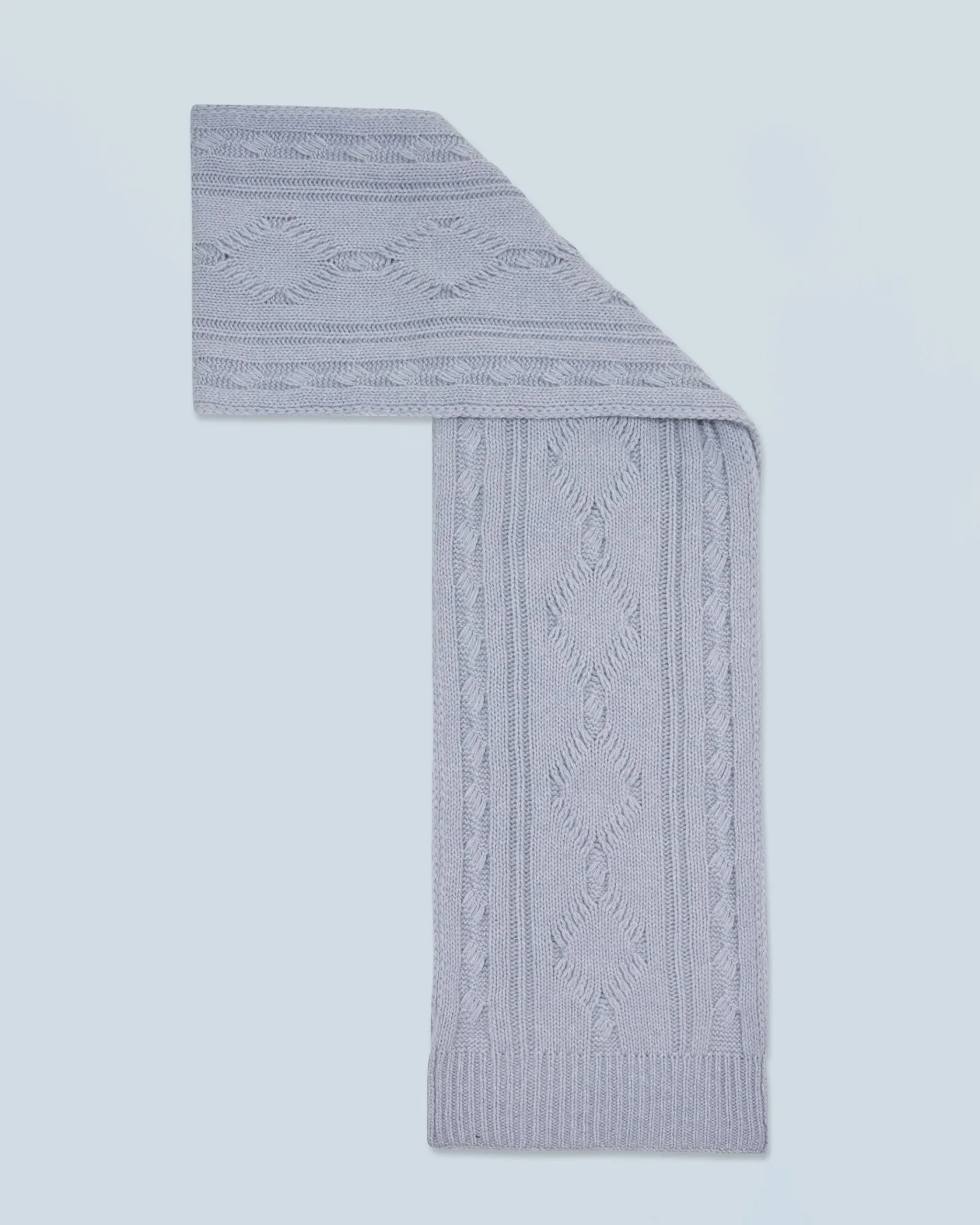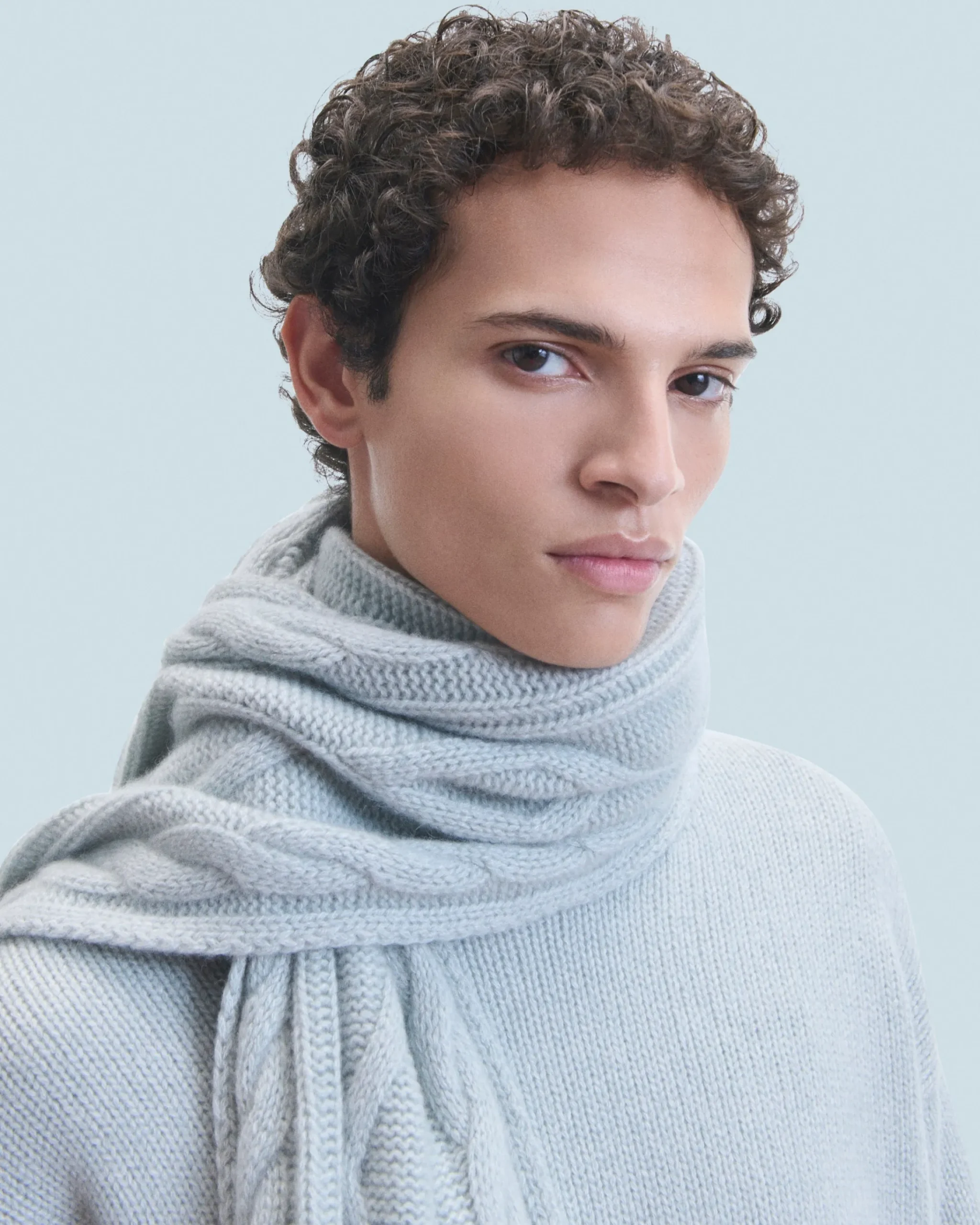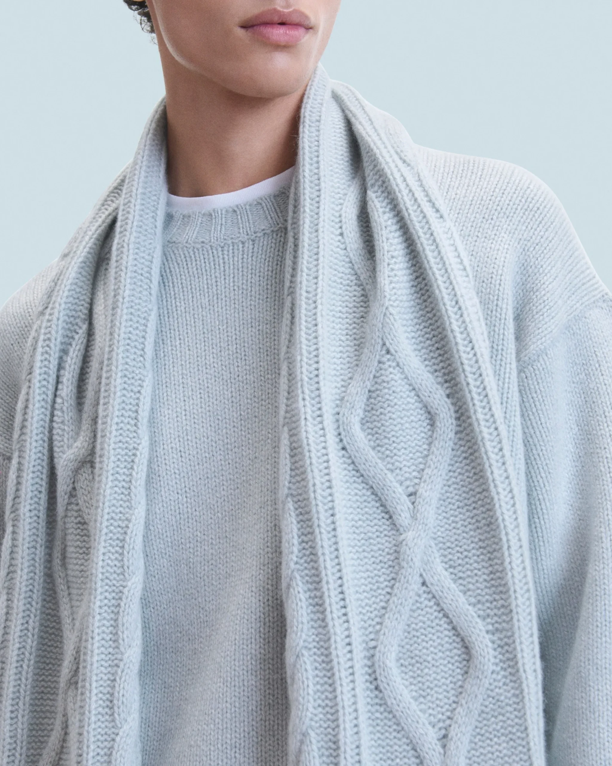 Avvolgiti dolcemente in questa sciarpa in cashmere, decorata con un gioco di trecce e bordi a costine. Un pezzo essenziale, apporta un tocco di eleganza alla tua silhouette.