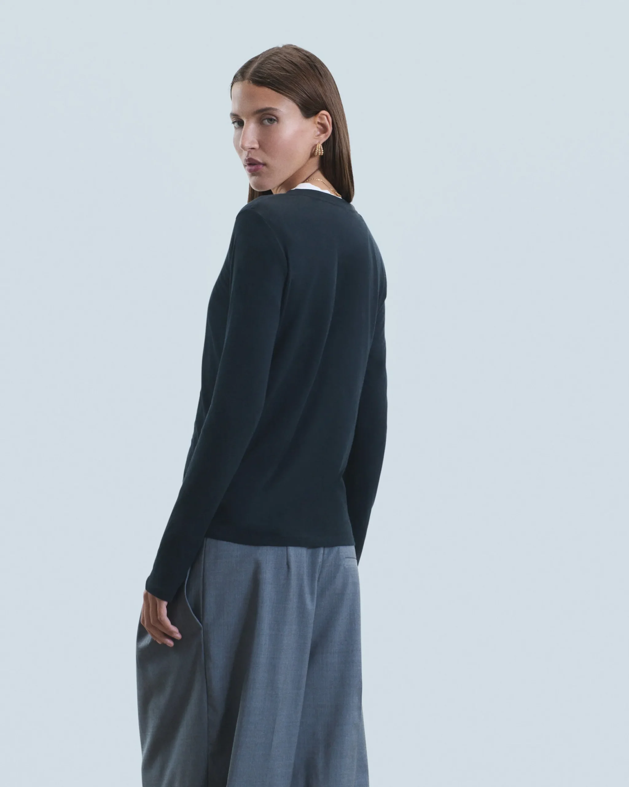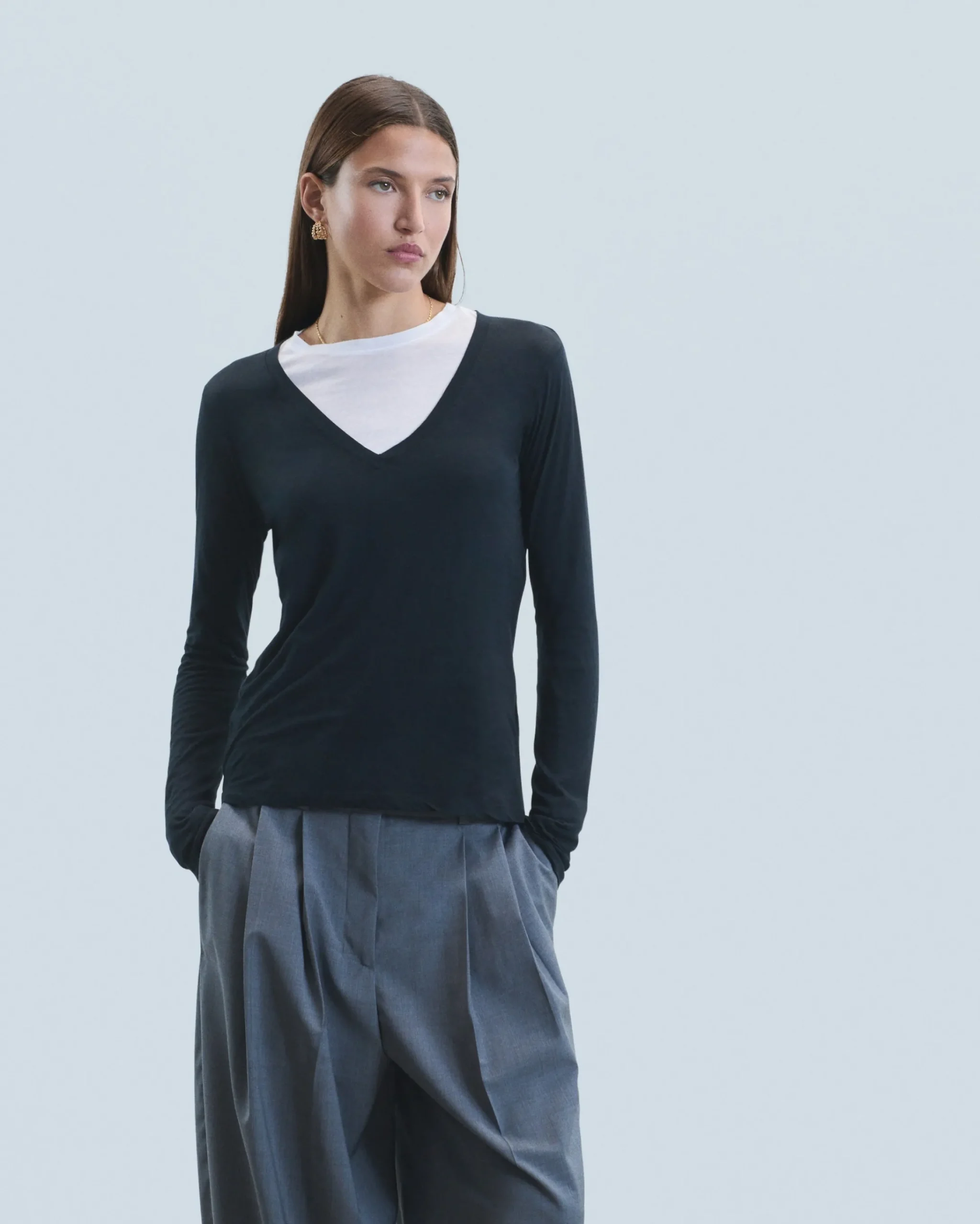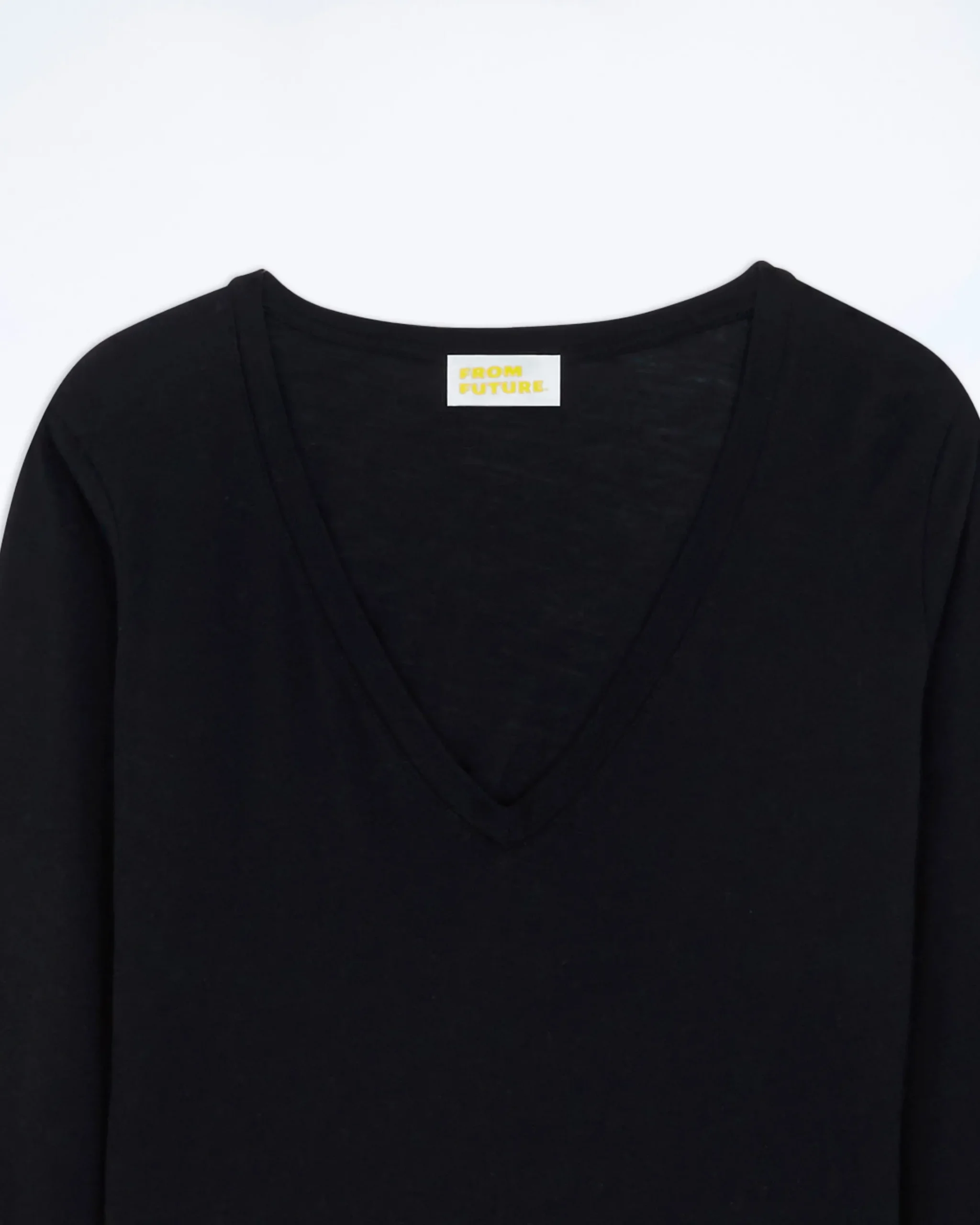 Pezzo indispensabile del guardaroba femminile, questa t-shirt in cotone è perfetta da indossare da sola o sovrapposta. Con uno scollo a V e maniche lunghe, combina comfort ed eleganza per completare i tuoi look di tutti i giorni. Adatta a tutti gli stili, puoi infilarla sotto un pullover a coste e abbinarci un pantalone da tailleur.