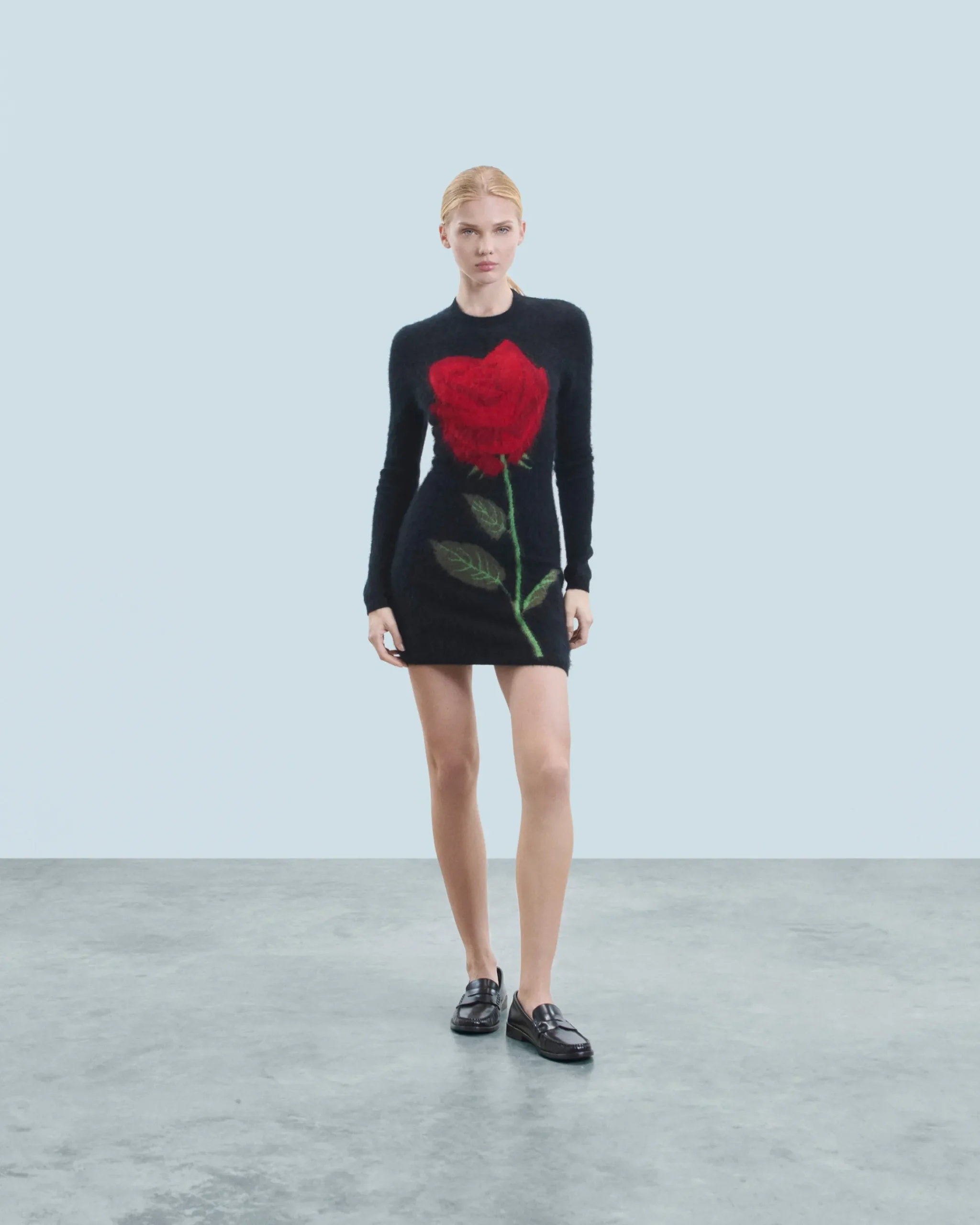 Elegante e audace, questo vestito corto e slim è impreziosito da un fiore delicato sul davanti per dare un tocco di freschezza al tuo stile. Confezionato in cashmere spazzolato, presenta uno scollo tondo e maniche lunghe.