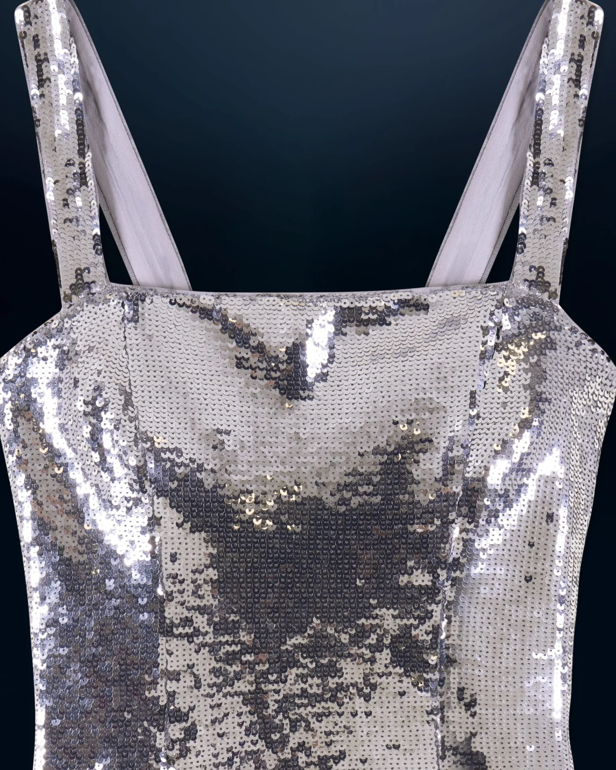 Abbagliante di sera, questo abito corto è tempestato di paillettes argentate. Con spalline larghe e una scollatura dritta, crea una elegantissima silhouette strutturata. Abbinalo a décolleté e una borsa coordinata per un look irresistibile.
