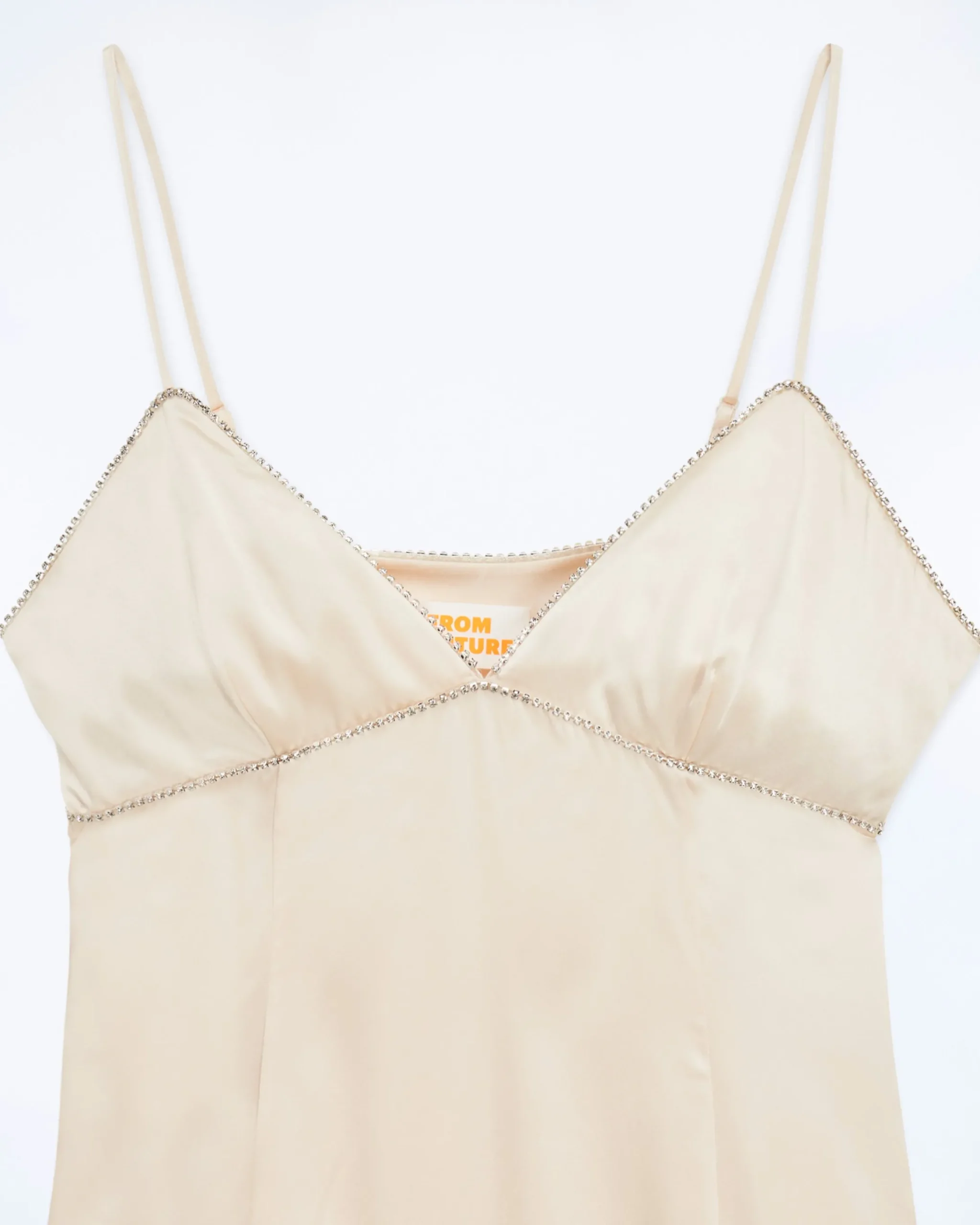 Confezionato in raso di seta lucido e leggero, questo vestito corto incarna tutta l’eleganza cosmica con le sue linee futuriste e un taglio morbido. Con spalline sottili, presenta uno scollo a V e una gonna con un piccolo spacco davanti. Da indossare a volontà, è perfetto sia di giorno che di sera, da solo o infilato sotto un top in maglia.