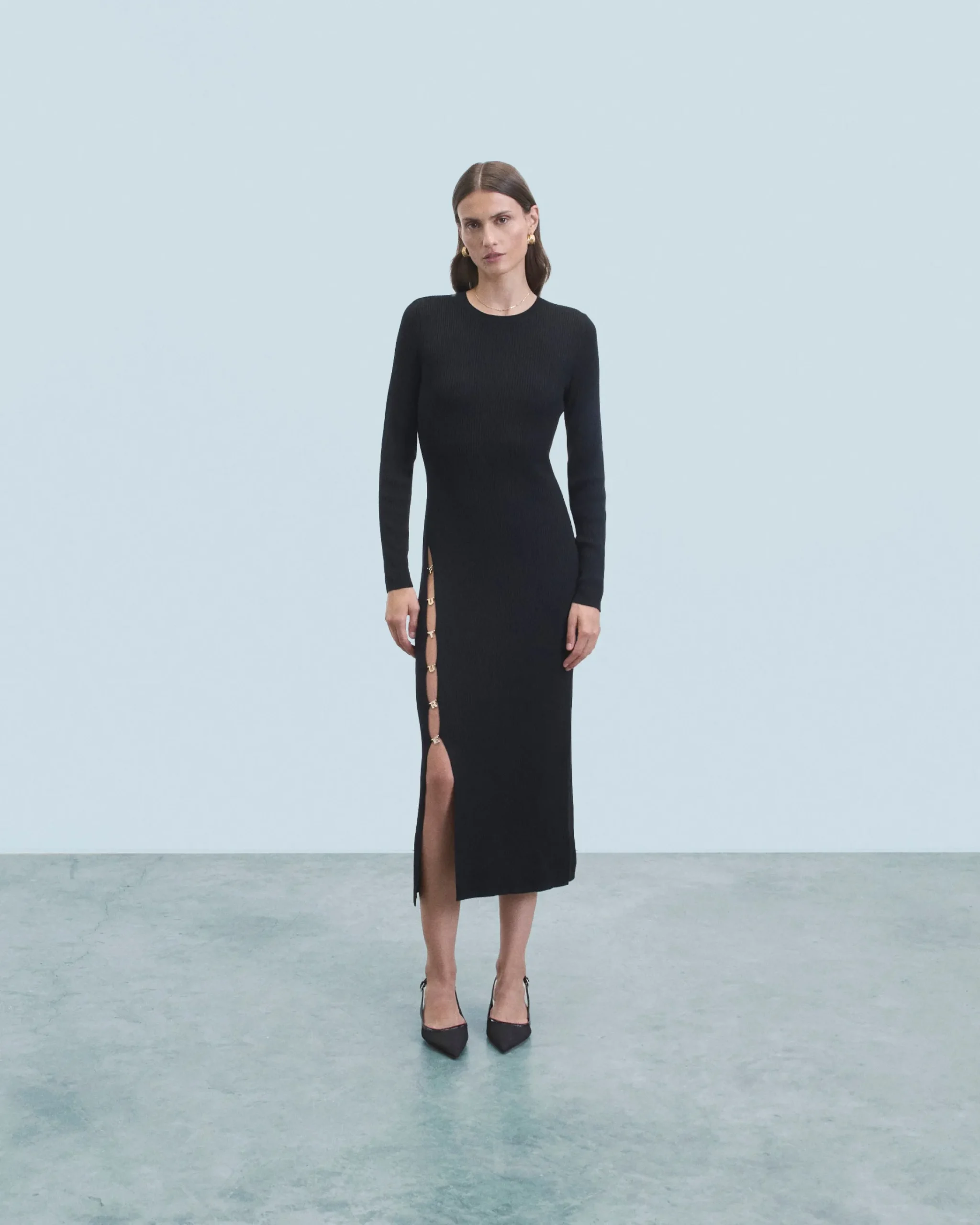 Confezionato in 100% lana merino certificata RWS (Responsible Wool Standard), questo vestito lungo a coste propone una gonna con spacco impreziosita da bottoni dorati “Future