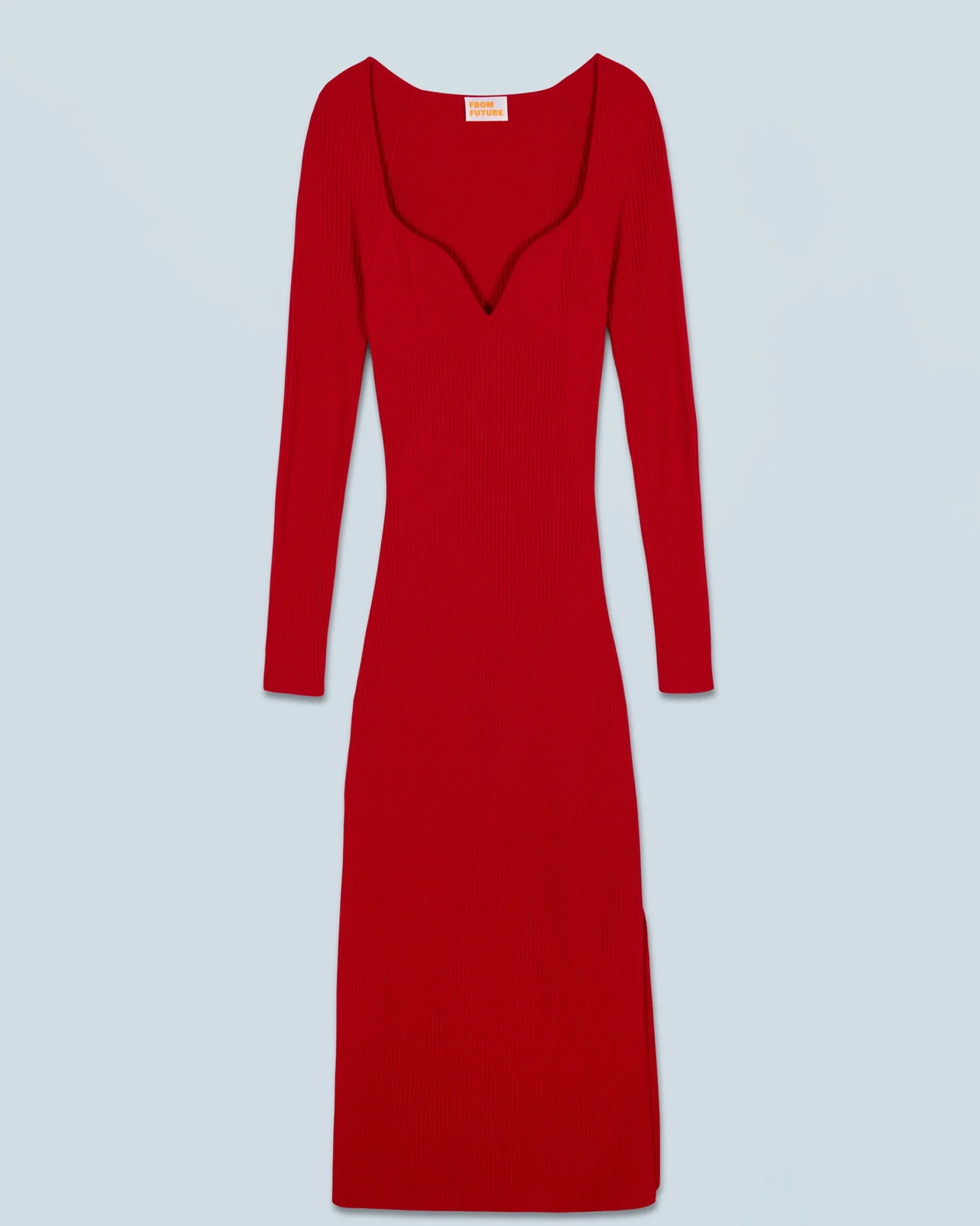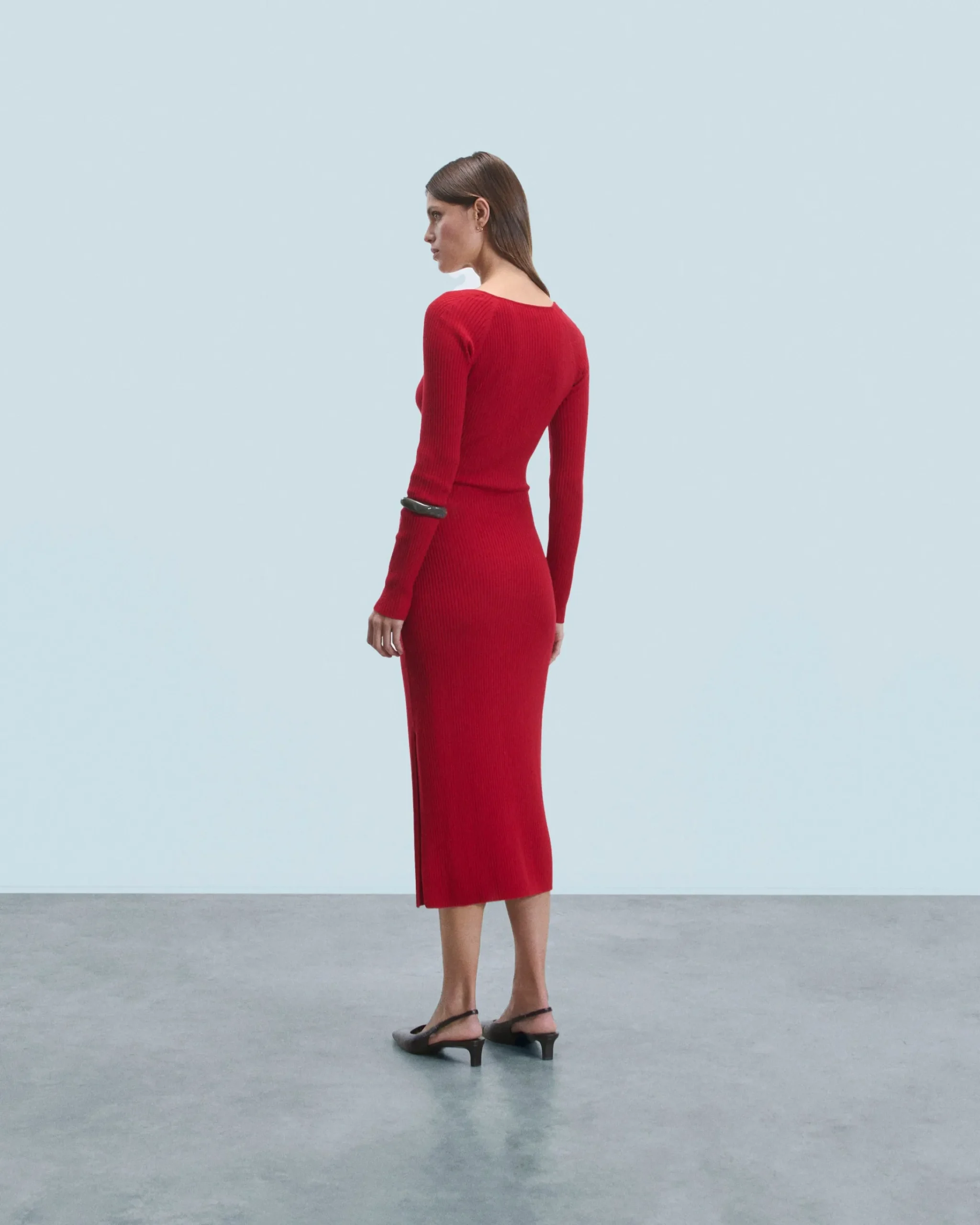 Una maglia a coste è la protagonista di questo vestito lungo e aderente, realizzato in lana merino certificata RWS (Responsible Wool Standard). Con maniche lunghe, presenta uno scollo a cuore e una gonna con spacco sottolineati da bordini a contrasto. Indossalo come una seconda pelle, con un paio di décolleté per un outfit sofisticato o con delle sneakers per un look più casual.