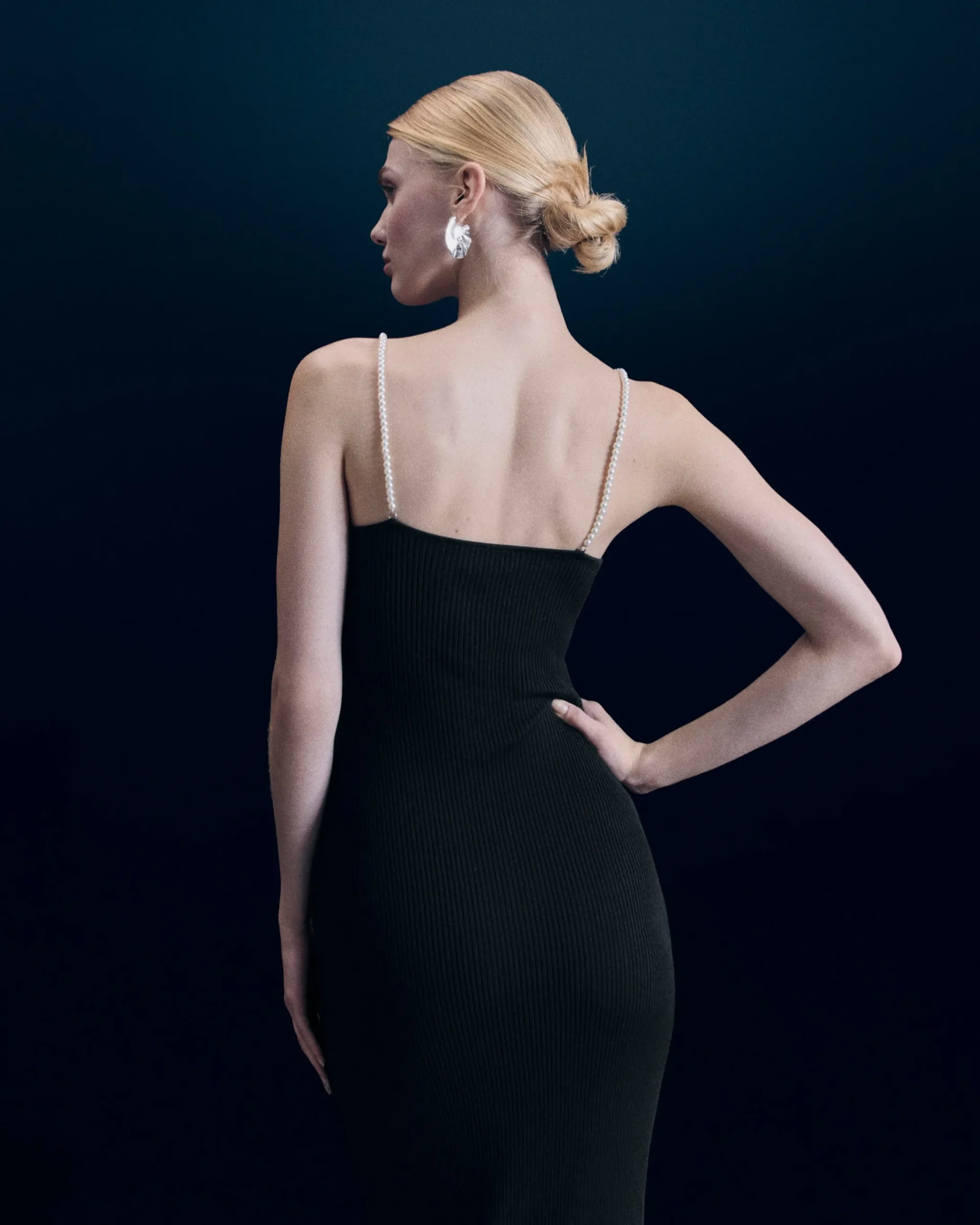 Realizzato in lana merino certificata RWS (Responsible Wool Standard), questo vestito lungo e a coste caratterizza una silhouette audace e sofisticata. Si indossa come una seconda pelle, con la sua scollatura a cuore e le spalline di perline argentate che creano un sottile gioco di luci. Perfetto per la sera, da abbinare a un paio di décolleté e a una borsetta.