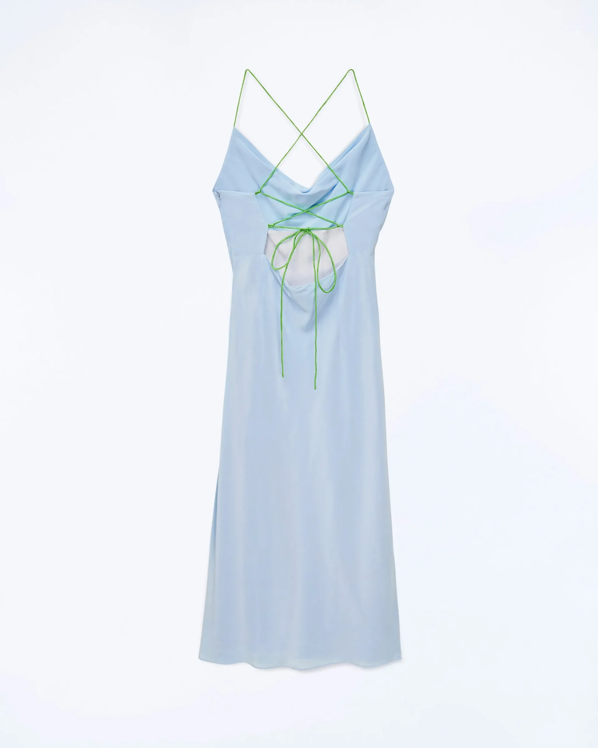 Con un’eleganza senza tempo e tutta l’audacia futurista, questo vestito lungo offre un look morbido e slim dal taglio svasato. Con spalline sottili a contrasto, presenta uno scollo tondo e una schiena scoperta impreziosita da laccetti incrociati da annodare.