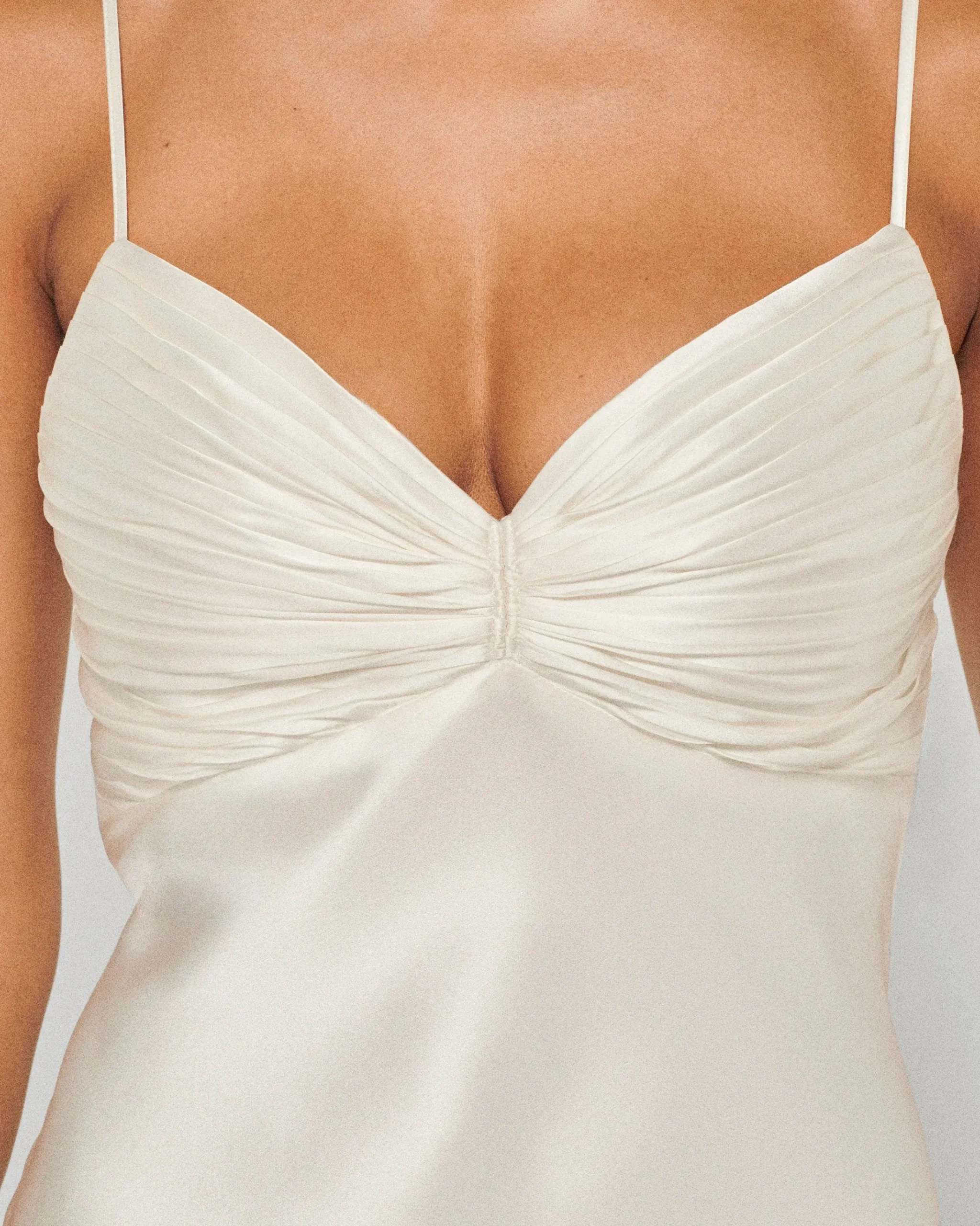 All’insegna della leggerezza, il vestito lungo slim Rosa in raso di seta valorizzerà il tuo look futurista. Con spalline sottili regolabili, presenta uno scollo ornato di arricciature e una gonna con spacco. Ideale sia di giorno che di sera, puoi indossarlo sia da solo che infilato sotto un top in maglia soffice.