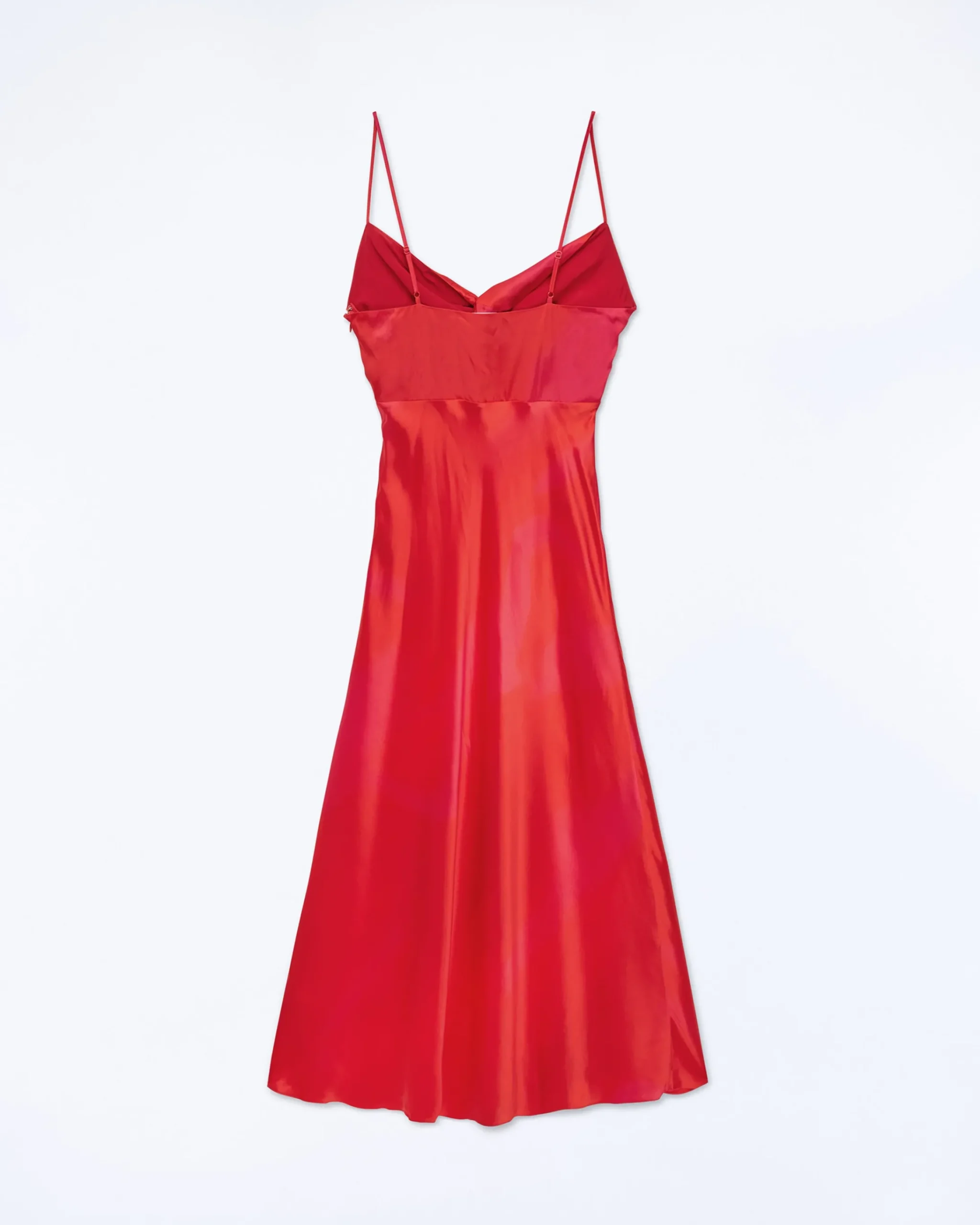 Confezionato in raso di seta, questo vestito lungo vivacizzato da una stampa utopica ti conduce verso un futuro cosmico. Con spalline sottili regolabili e una chiusura a zip, presenta uno scollo annodato con un cut-out sul davanti e un taglio svasato dalla vestibilità morbida.