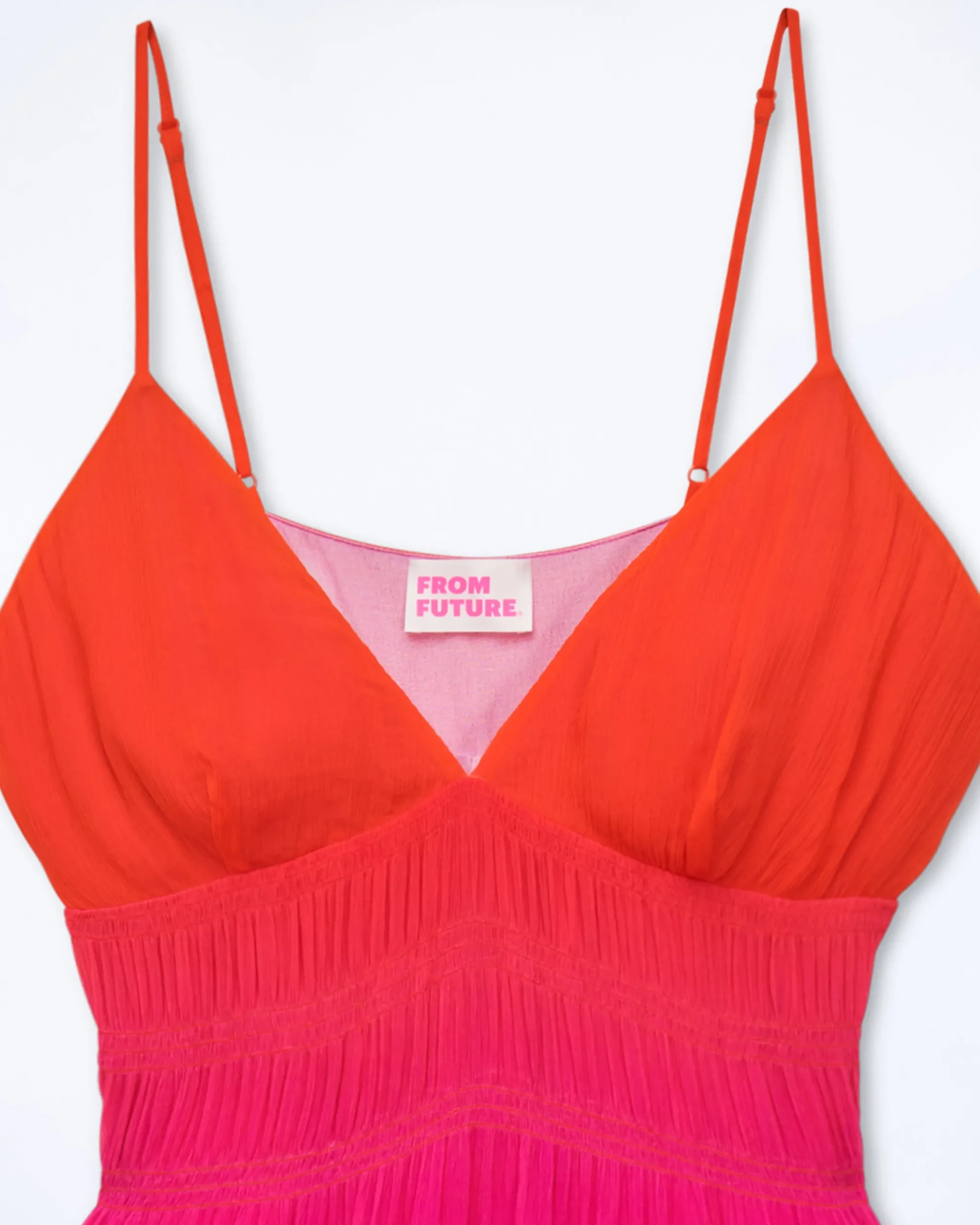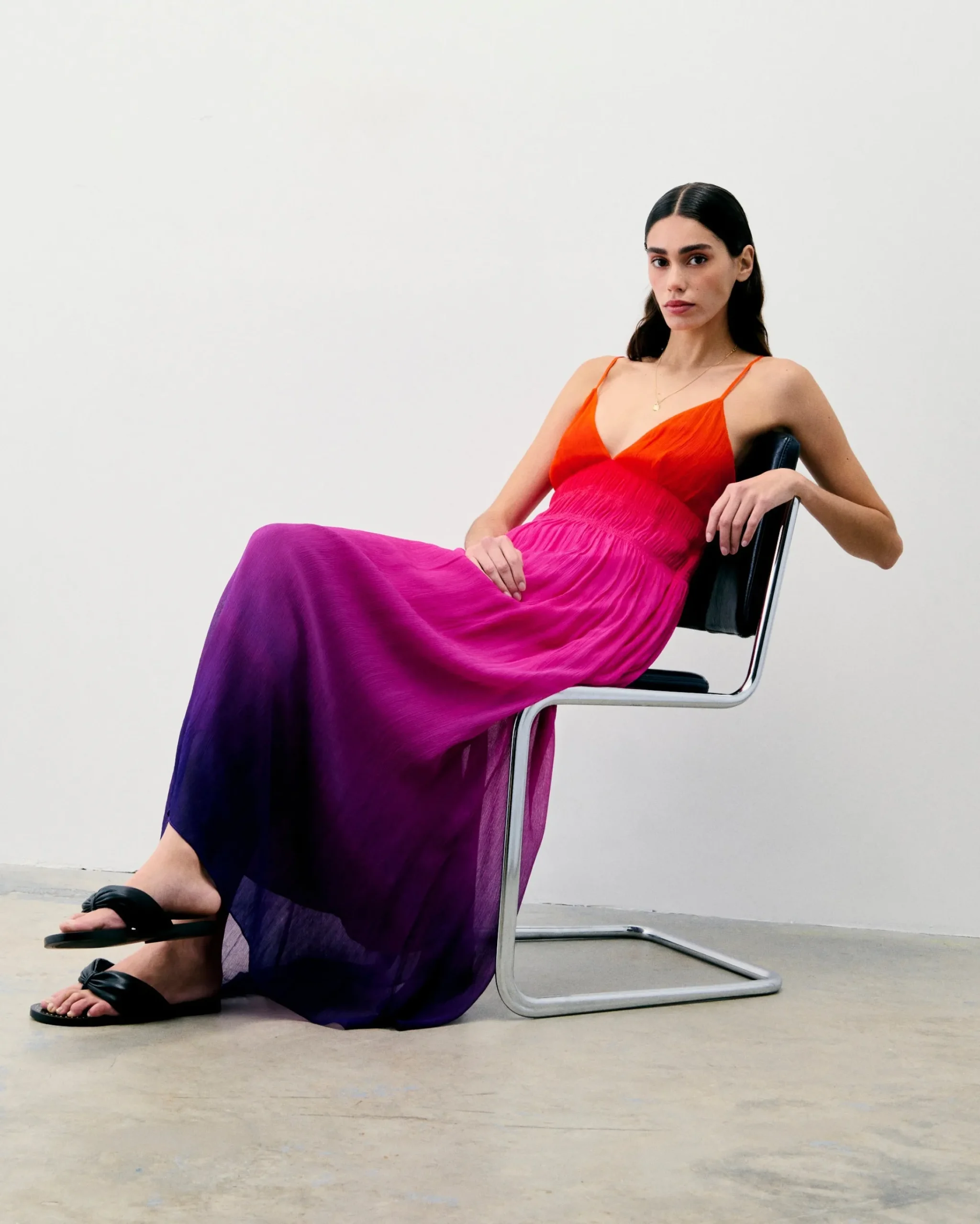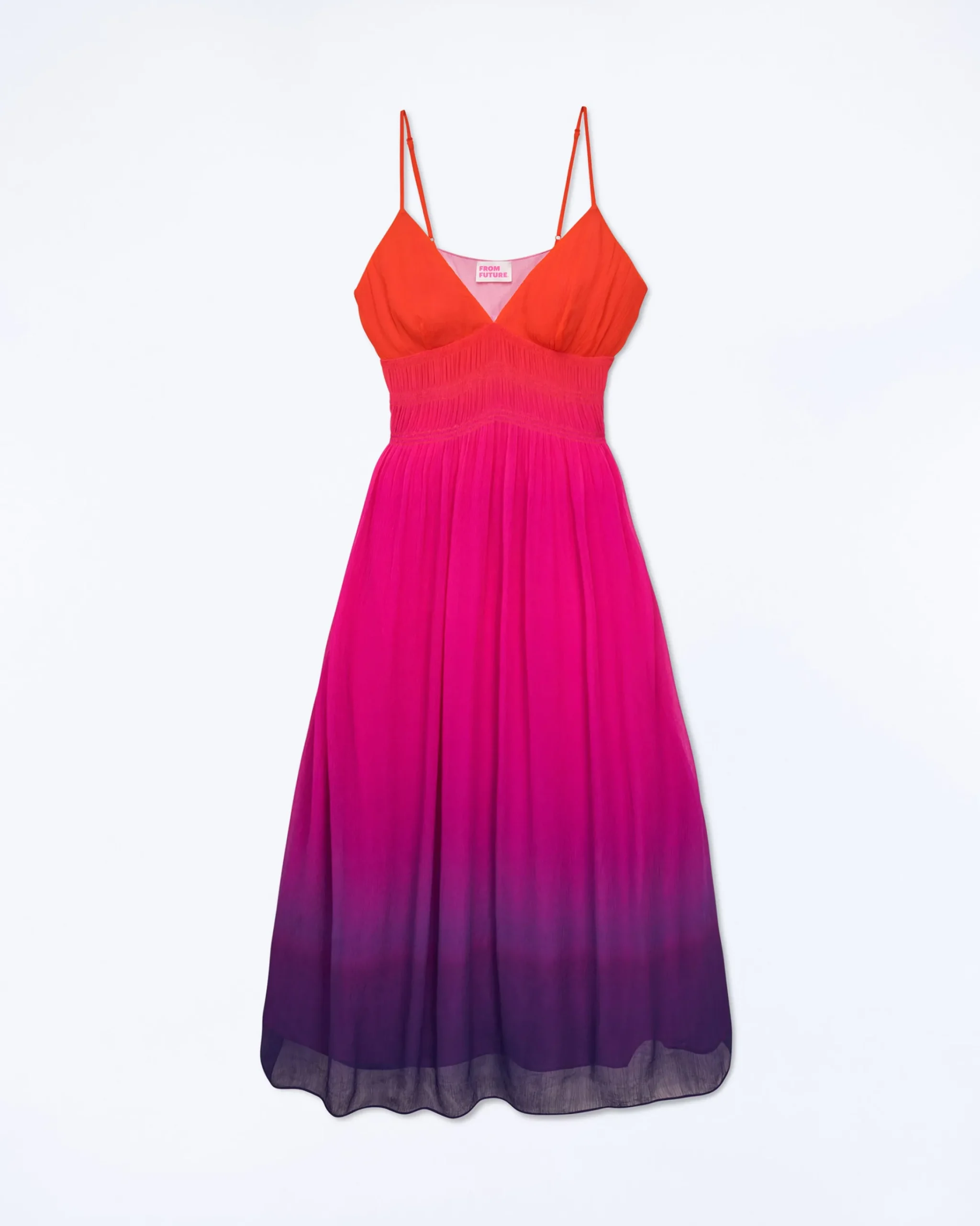 Questo vestito lungo ti conduce verso nuovi orizzonti cosmici. Con uno scollo a V e spalline sottili, presenta un look morbido e slanciato, accentuato da un’arricciatura in vita e da una gonna svasata. Protagonista del tuo guardaroba futurista, puoi indossarlo sia di giorno che di sera.