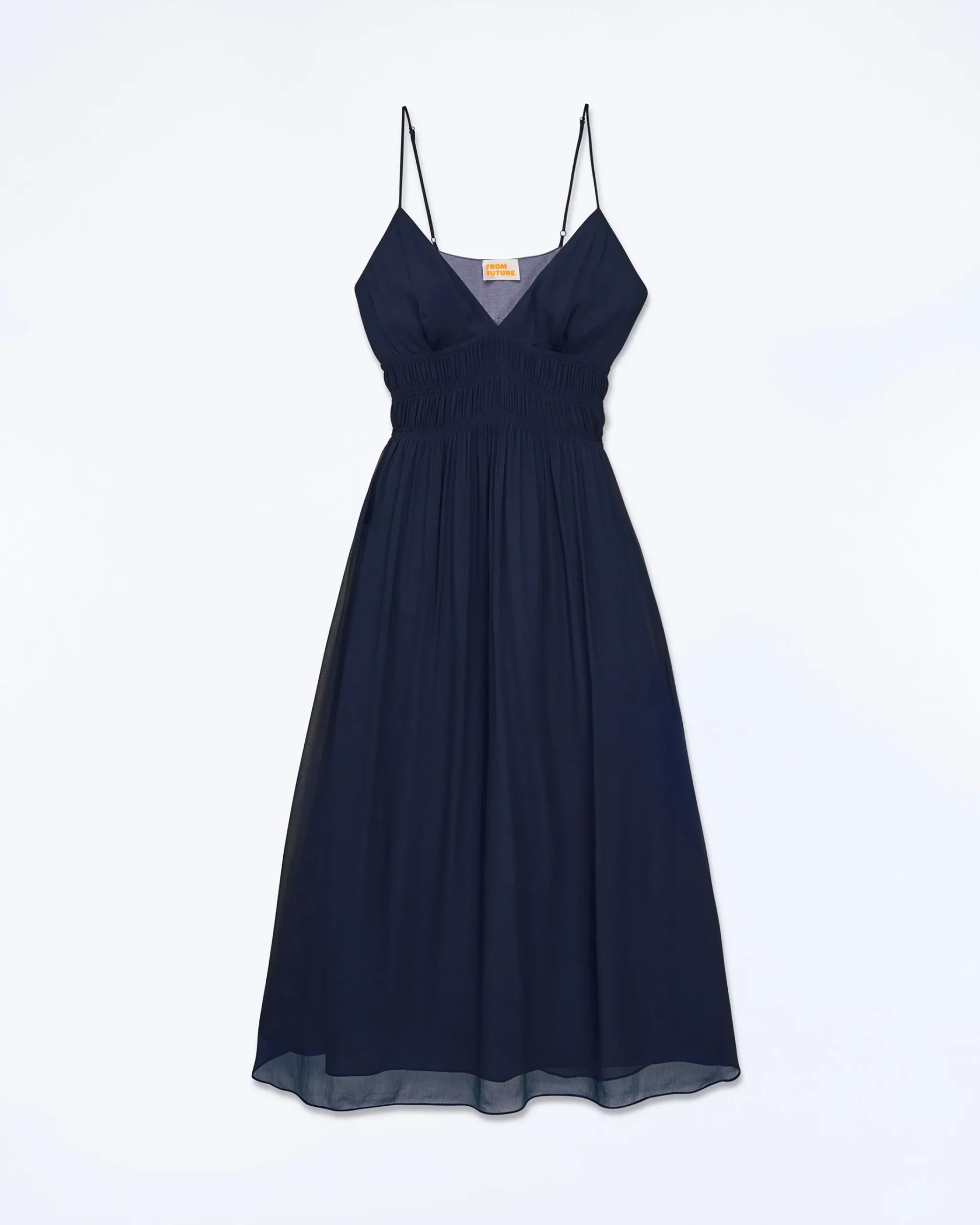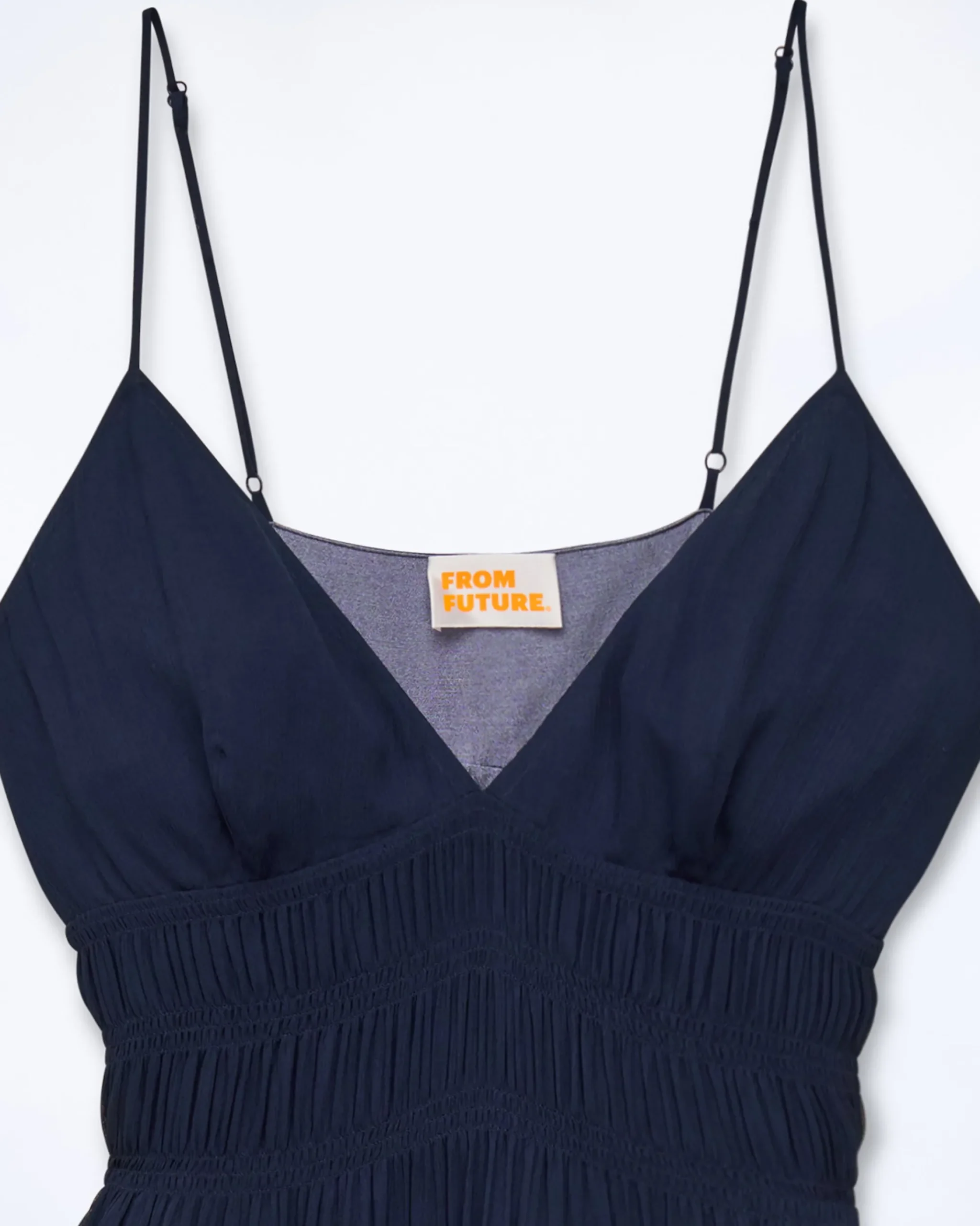 Questo vestito lungo ti conduce verso nuovi orizzonti cosmici. Con uno scollo a V e spalline sottili, presenta un look morbido e slanciato, accentuato da un’arricciatura in vita e da una gonna svasata. Protagonista del tuo guardaroba futurista, puoi indossarlo sia di giorno che di sera.