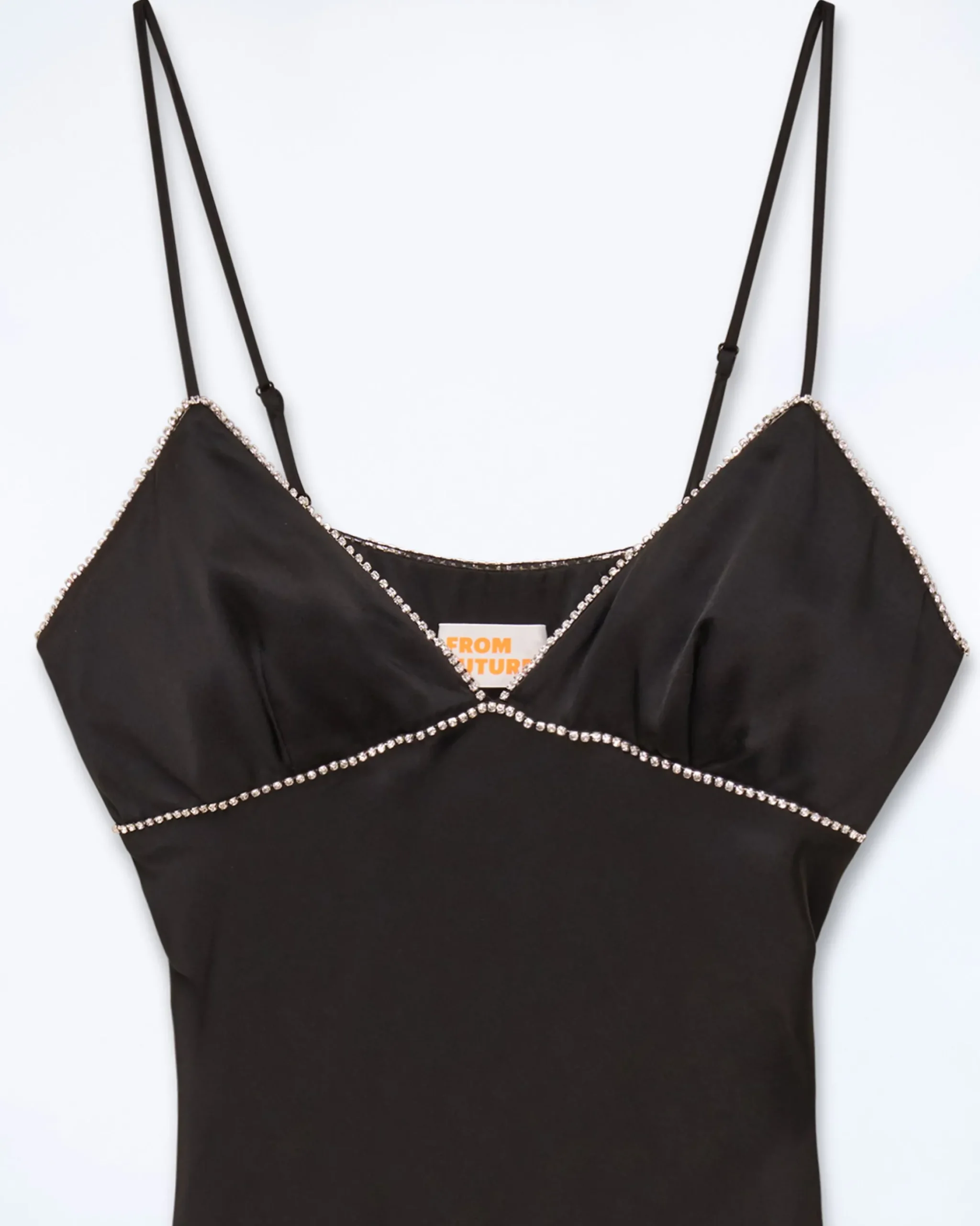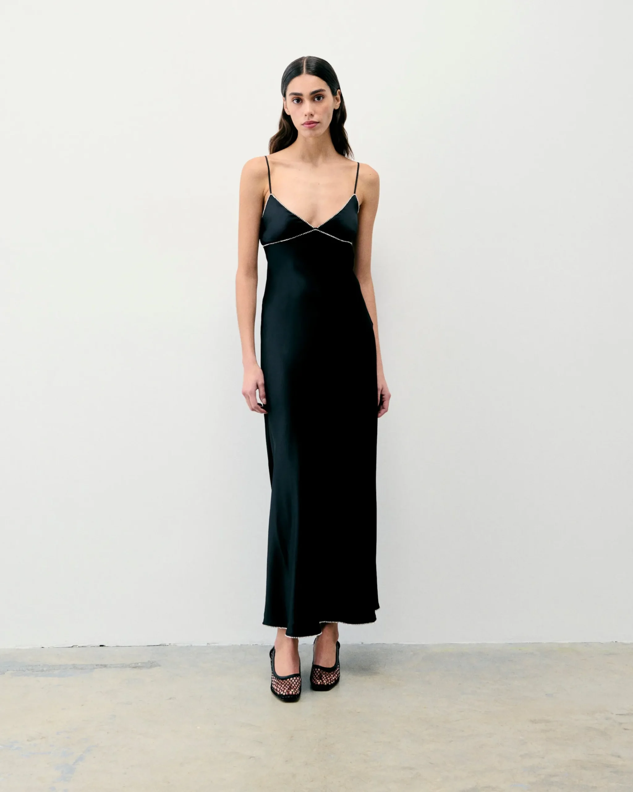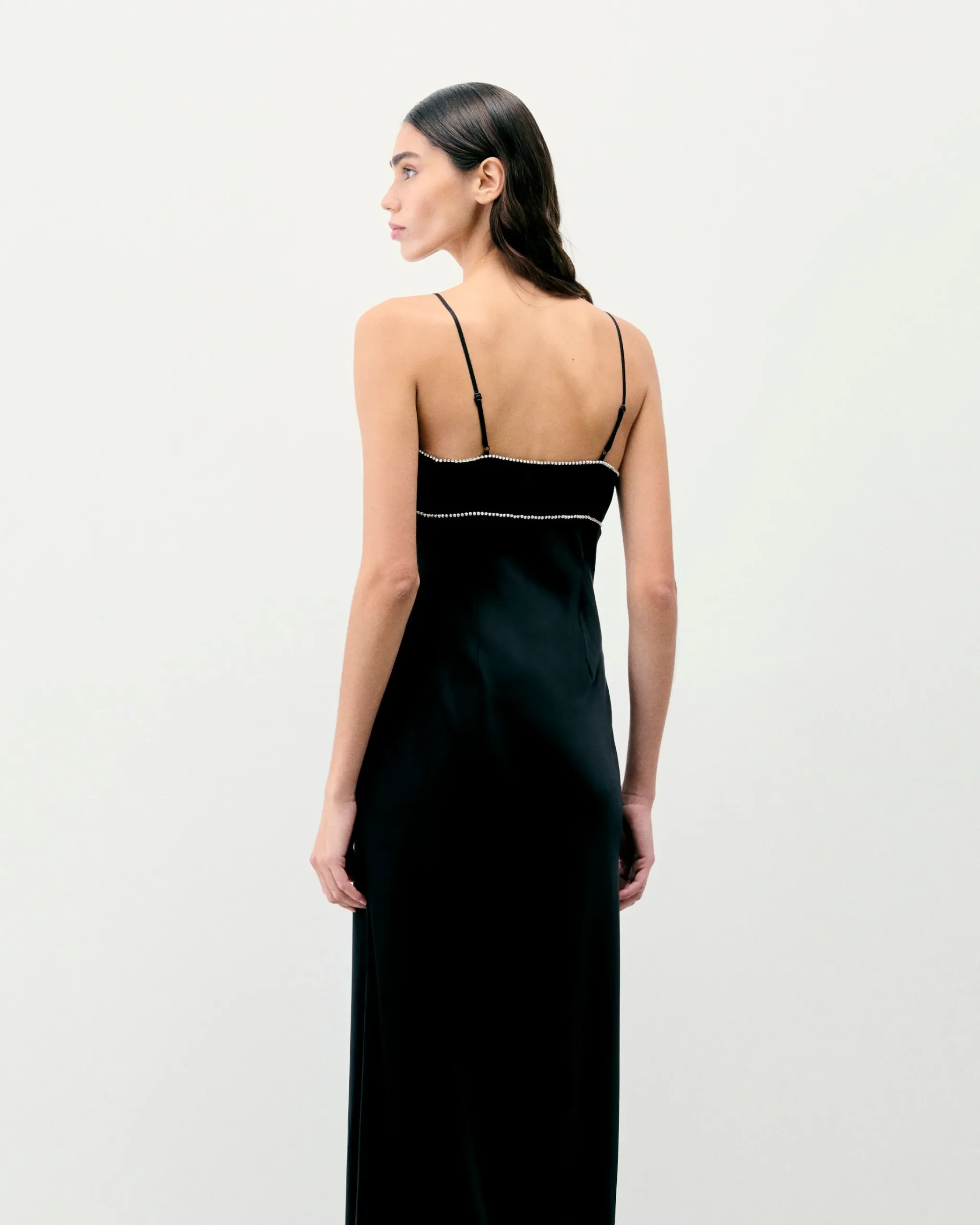 Impregnato d’eleganza, il vestito lungo e slim Tess in raso di seta è impreziosito da dettagli audaci. Con spalline sottili regolabili, presenta uno scollo a V con bordi ornati di strass e una gonna morbida.