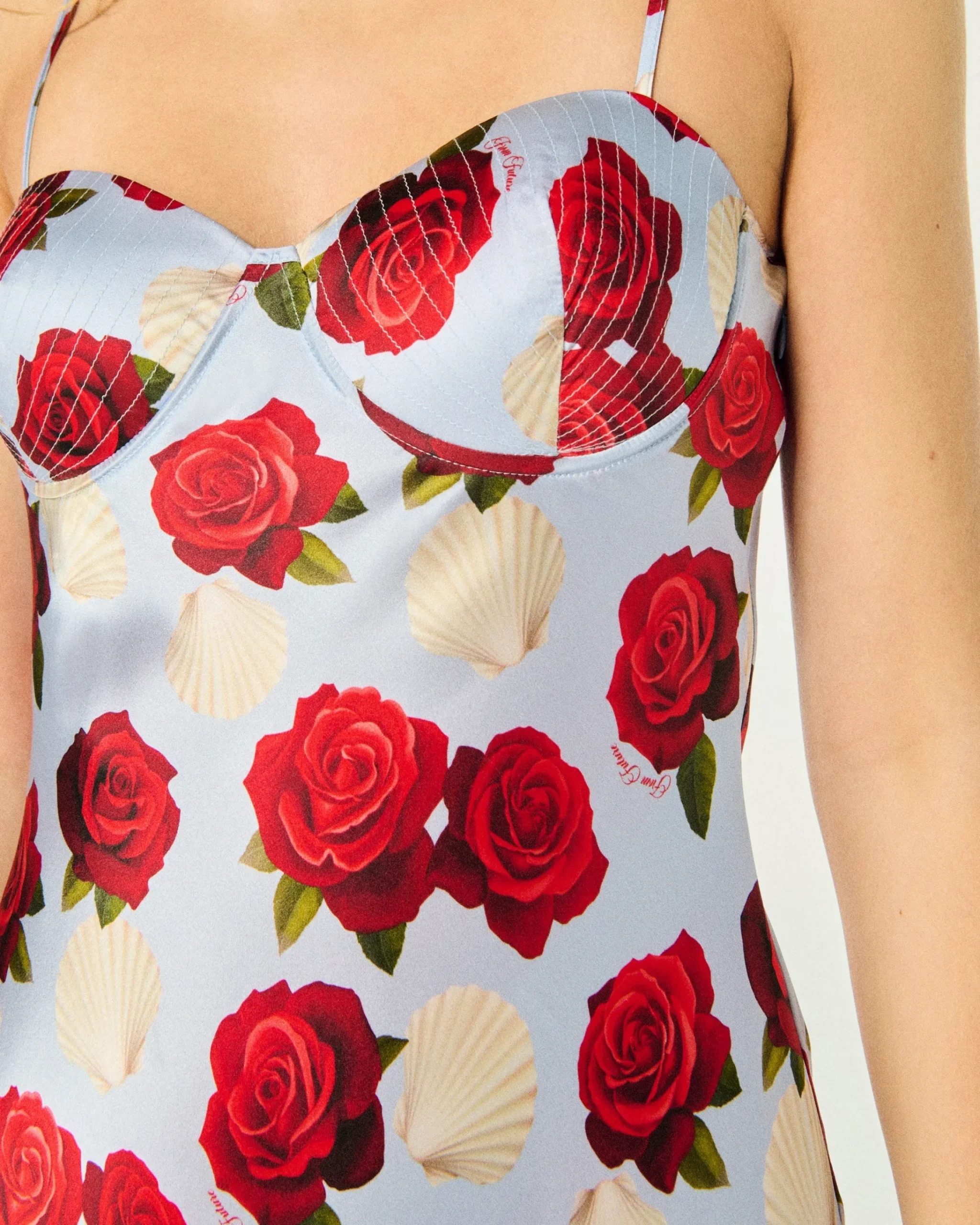 Sulla spiaggia deserta… Una stampa a tema conchiglie e crostacei è la protagonista di questo vestito lungo confezionato in raso di seta. Con spalline sottili, presenta uno scollo a cuore e un fondo svasato per un look futurista decisamente audace.